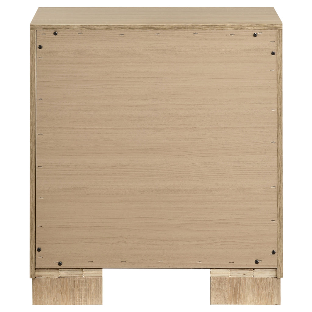 Two-drawer nightstand in light oak finish with a compact and squared modern profile