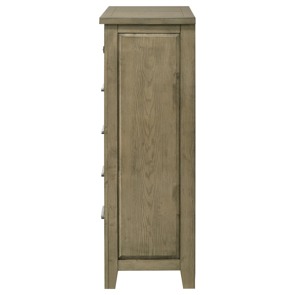 Designed with a relaxed sensibility, this five-drawer chest of drawers blends classic structure with subtle rustic appeal. Its vineyard oak finish highlights the oak grain embossing across solid rubberwood and engineered veneer surfaces. Antique nickel pull handles add a touch of industrial charm, while heavy-duty ball bearing glides ensure smooth, dependable drawer operation. A balanced blend of softness and strength for modern bedroom storage.