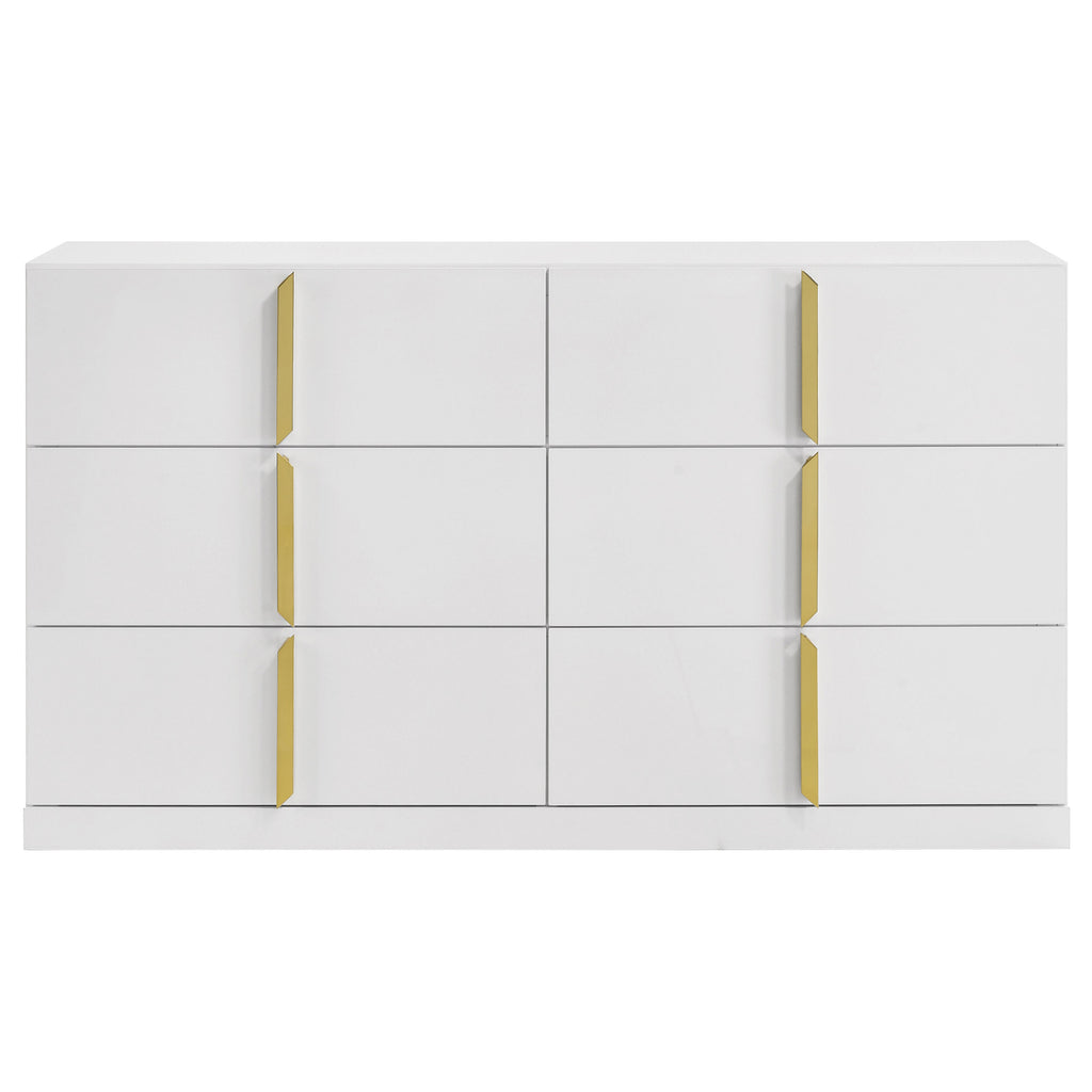 Clean and structured, this six-drawer dresser draws from Italian contemporary style to deliver bold presence and refined function. Finished in white high gloss PET thermoplastic, it offers a scratch-resistant, moisture-resistant surface that is both durable and eco-friendly. Vertically mounted polished gold pulls create a sculptural centerline across six smooth-gliding drawers, combining sleek storage with standout design.