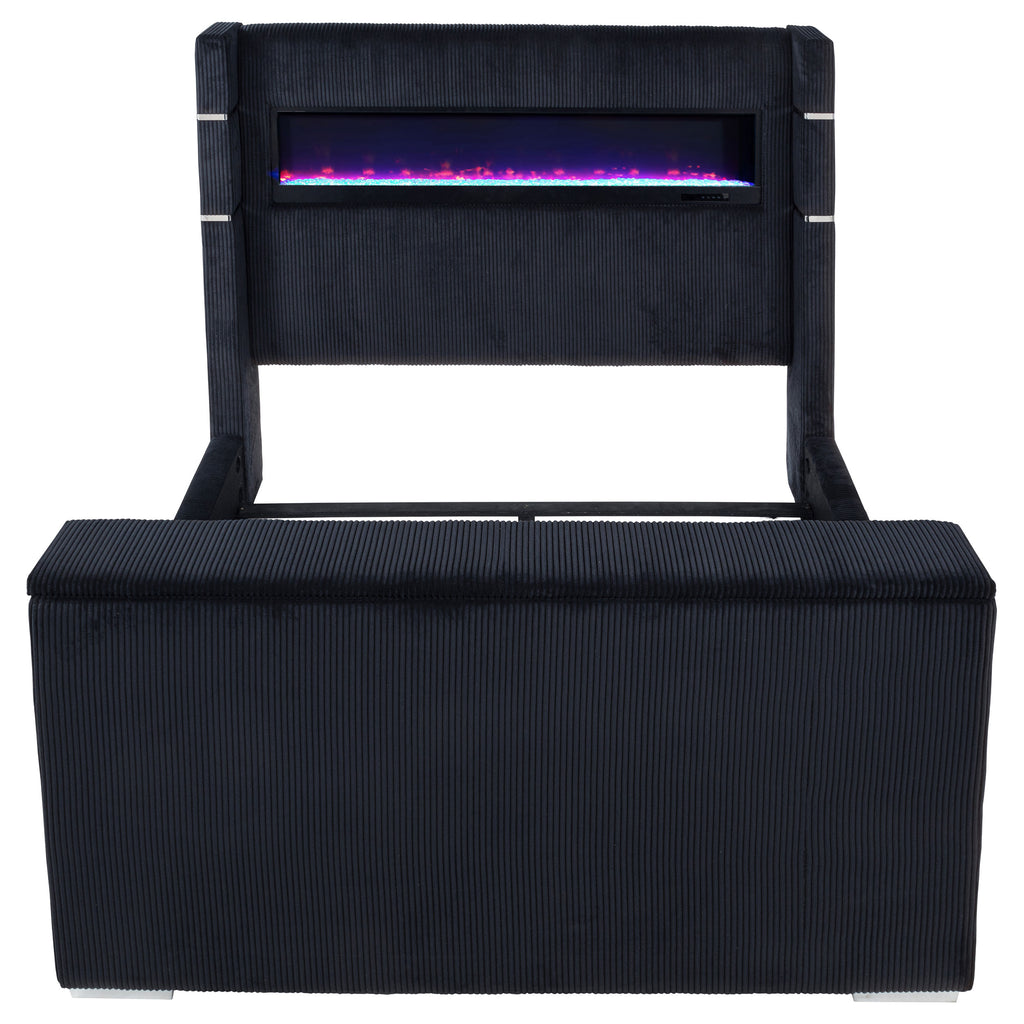 Headboard includes crystal flame visualizer with sixteen color options and no heat output