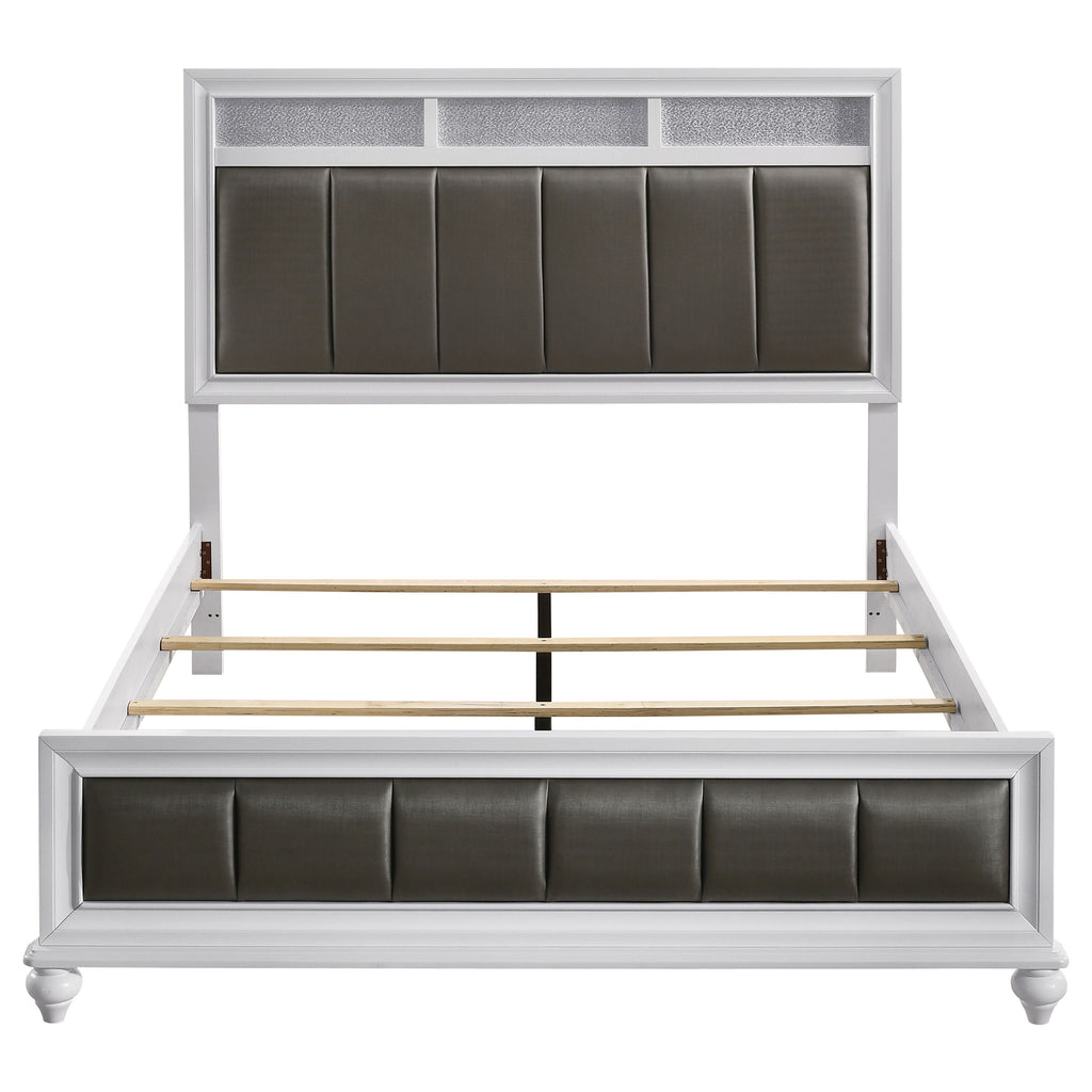 Perfectly suited for more transitional bedrooms, this panel bed features a tall panel headboard and footboard. With a white finished frame throughout, this bed offers extra touches such as channel tufted paneling wrapped in a metallic leatherette upholstery and sparkling accents. The white frame also features molding accents a well as turned feet on the footboard. Place this bed in a primary suite to lend a more glamorous vibe. This bed frame is available in several sizes as well.