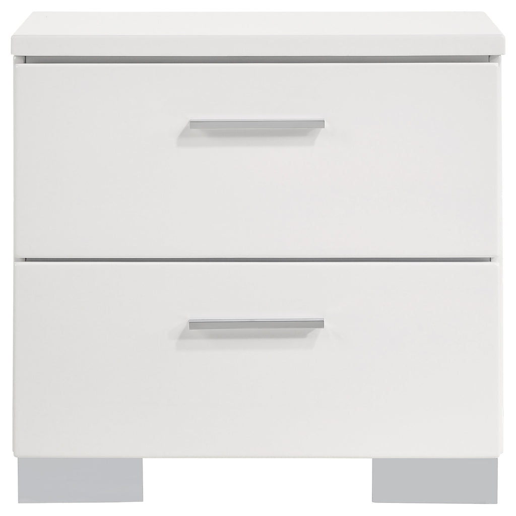Upgrade your bedroom with this ultra-modern platform bed and matching case pieces. The bed features a sleek white faux leather upholstery with horizontal channel tufting, while its low-profile design enhances the contemporary aesthetic. Case pieces are finished in a polished white high-gloss polyurethane for a clean, sophisticated look. Polished chrome metal bar handles provide a sleek contrast, while spacious drawers with felt-lined top sections offer both style and functionality.