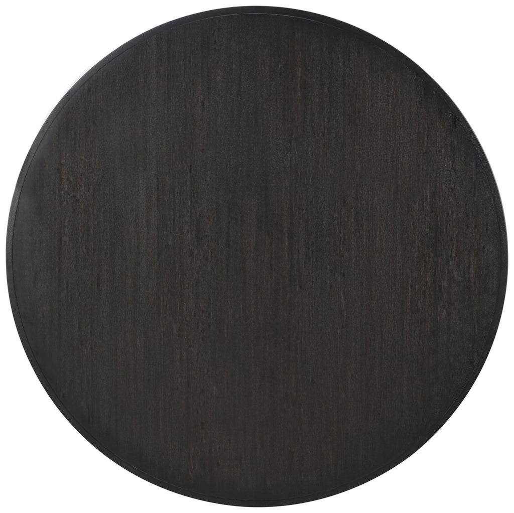 Sixty-inch round dining table finished in burnished black for a dramatic modern presence