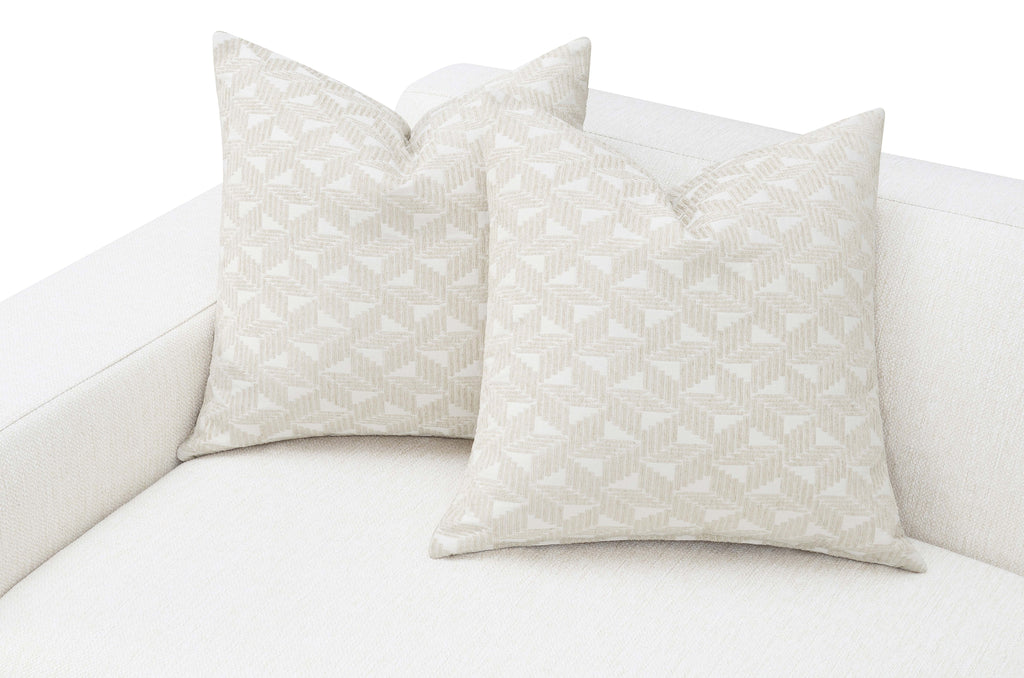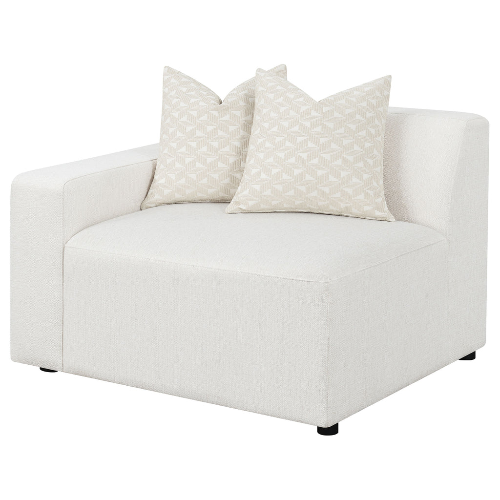 Bridge two modular sectional pieces together effortlessly with this modern corner chair, designed in an easy-to-maintain bright pearl performance upholstery across its foam padded pocket coil seat and a low-profile backrest. Bold black round legs offer a touch of contrast as they peek out from the bottom edge of this modular corner chair.