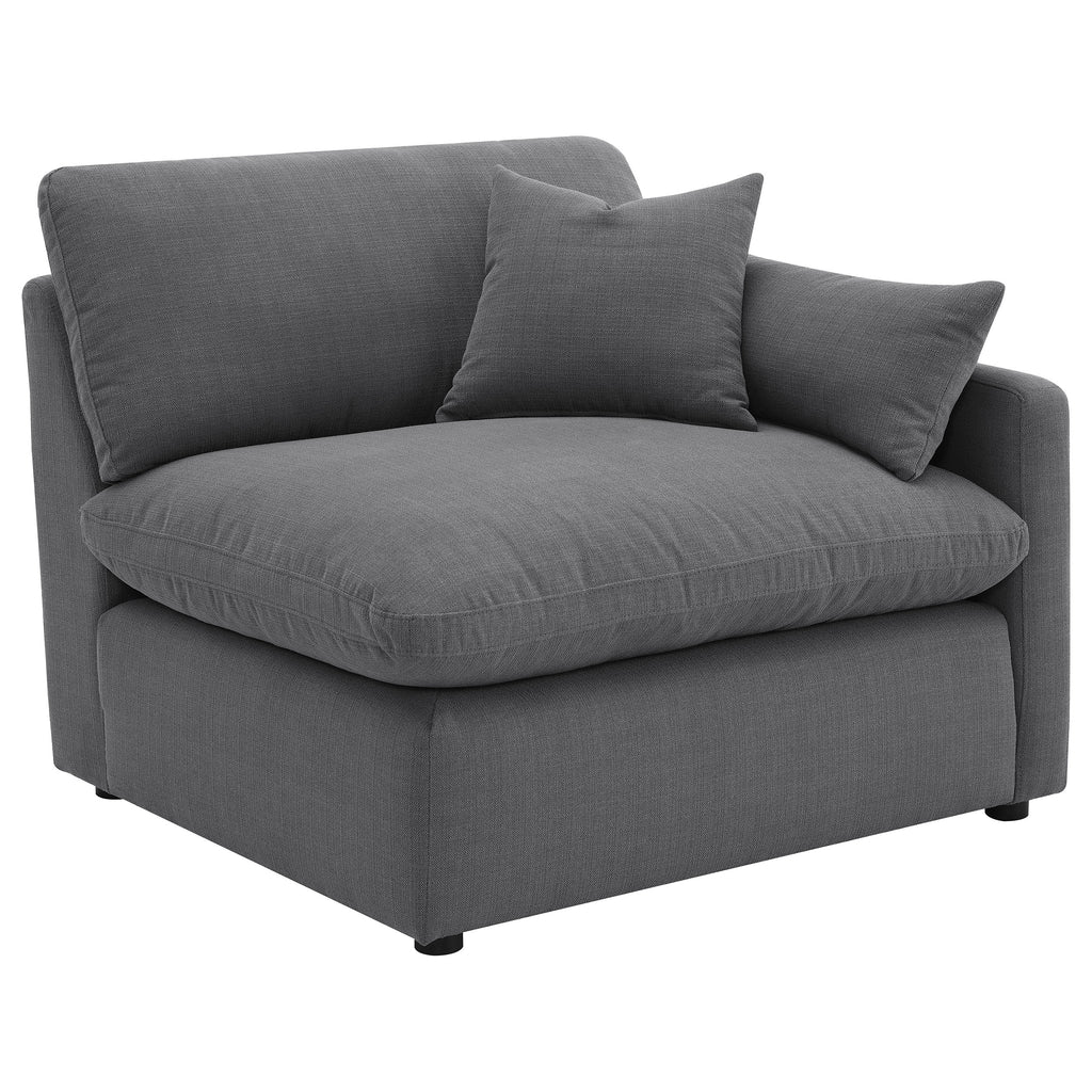 Complete your spacious modern living room with this beautifully designed modular sectional, featuring soft, textural fabric. Feather blend-wrapped box cushion seating with reversible cushions and topstitched details, paired with a thin track arm design, create a sleek, modern aesthetic to elevate your family room and beyond. Matching accent pillows and plush back cushions add extra comfort, nestled against the sloped track armrests. This sectional is perfect for complementing your existing decor, welcoming neutral tones, or providing a sophisticated backdrop to vibrant colors.