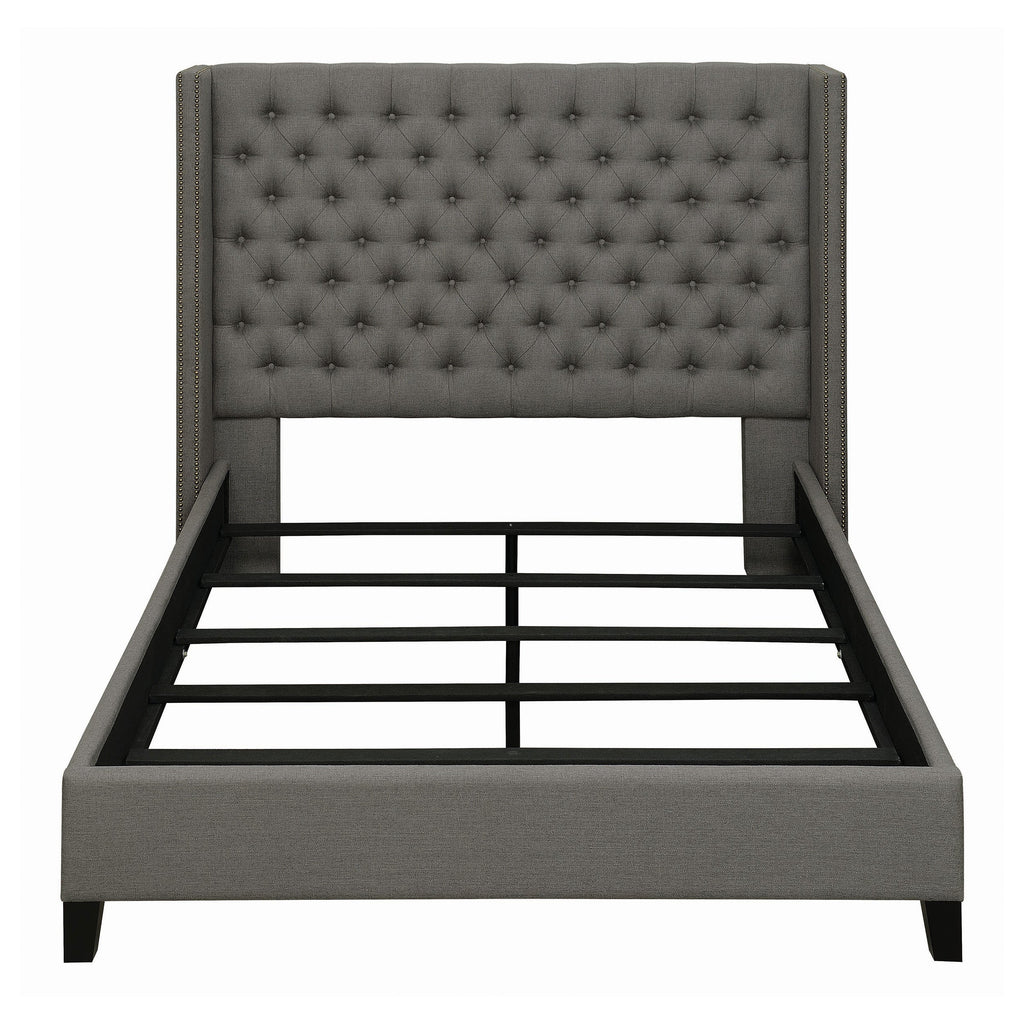 We love the cozy ambiance created with a demi-wing design in this modern upholstered headboard. Perfect for freshening up your bedroom, it offers a contemporary look with classic design details that bring intriguing richness. Dark gray upholstery is padded and button tufting, creating depth and dimensionality. Wings are lined with individually applied nail heads that showcase a warm bronze finish, offering the perfect touch of character. Pair with linens in a soothing color to create a refined, inviting presence in your bedroom.