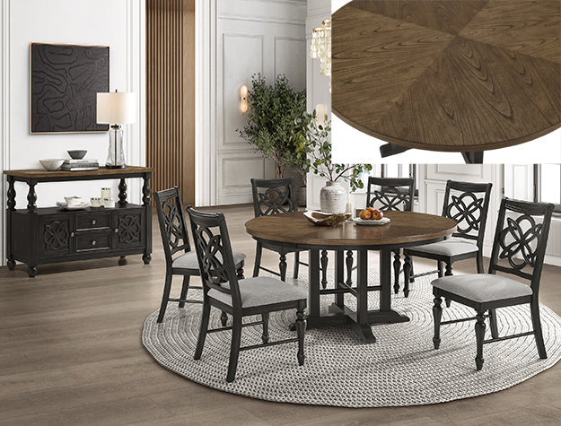This elegant dining group brings a vintage style to your space. The sturdy 2 tone table features an open four leg pedestal base and a quarter matched veneer top. Seating is upholstered a decorative quatrefoil design is highlighted on the chair backs.