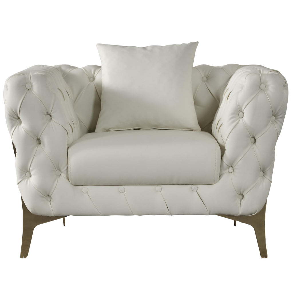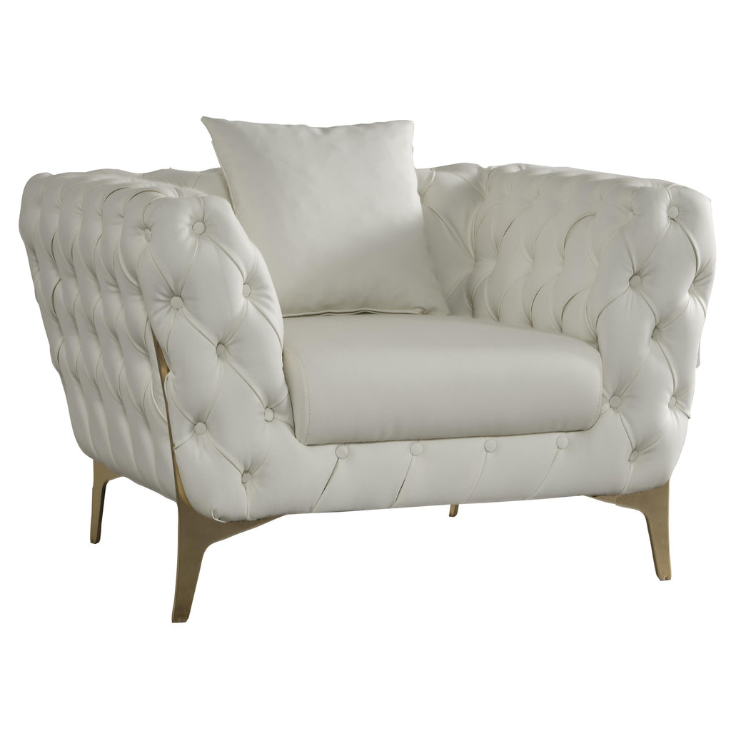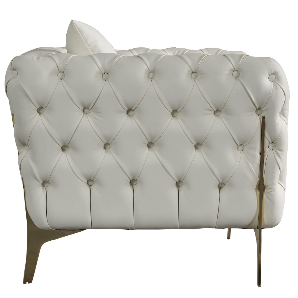 Add flair to your home with this cream Aurora vegan leather chair. Featuring rich, soft cream vegan leather and deep button tufting, this chair is both comfortable and stylish. Gold stainless steel legs and a wood construction provide ample support for all who wish to have a seat. The included pillows give additional comfort when you want to kick back and relax. The Aurora vegan leather chair's wide frame makes it perfect for any open space.