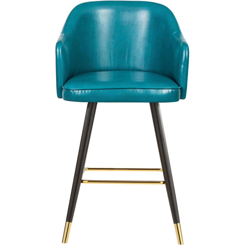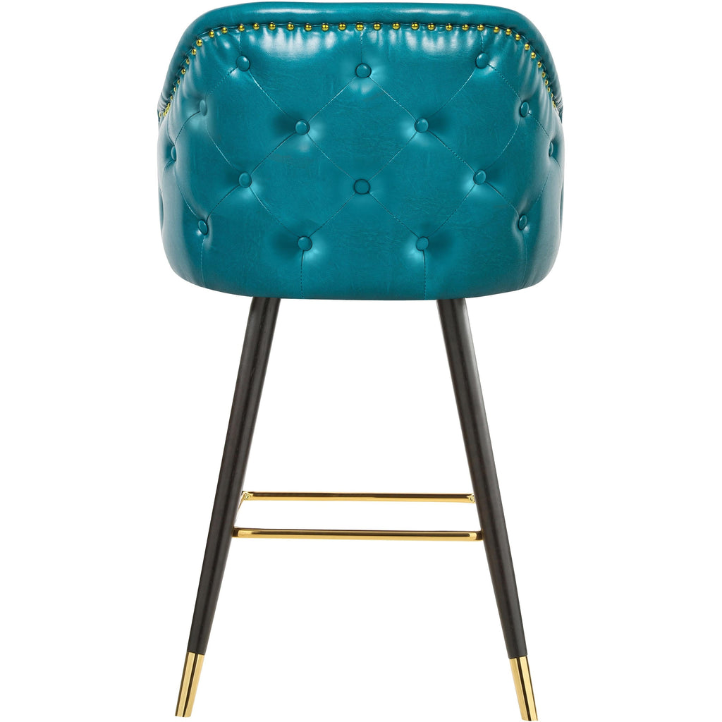 Traditional beauty comes to your home counter area with this Barbosa vegan leather counter stool. The rich, soft blue vegan leather looks so real, folks will really think it is. The chair rests on matte black metal legs and has a gold footrest with gold caps on its tips for a modish finish. Deep tufting on the back of the seat adds a classic sense of refined style.