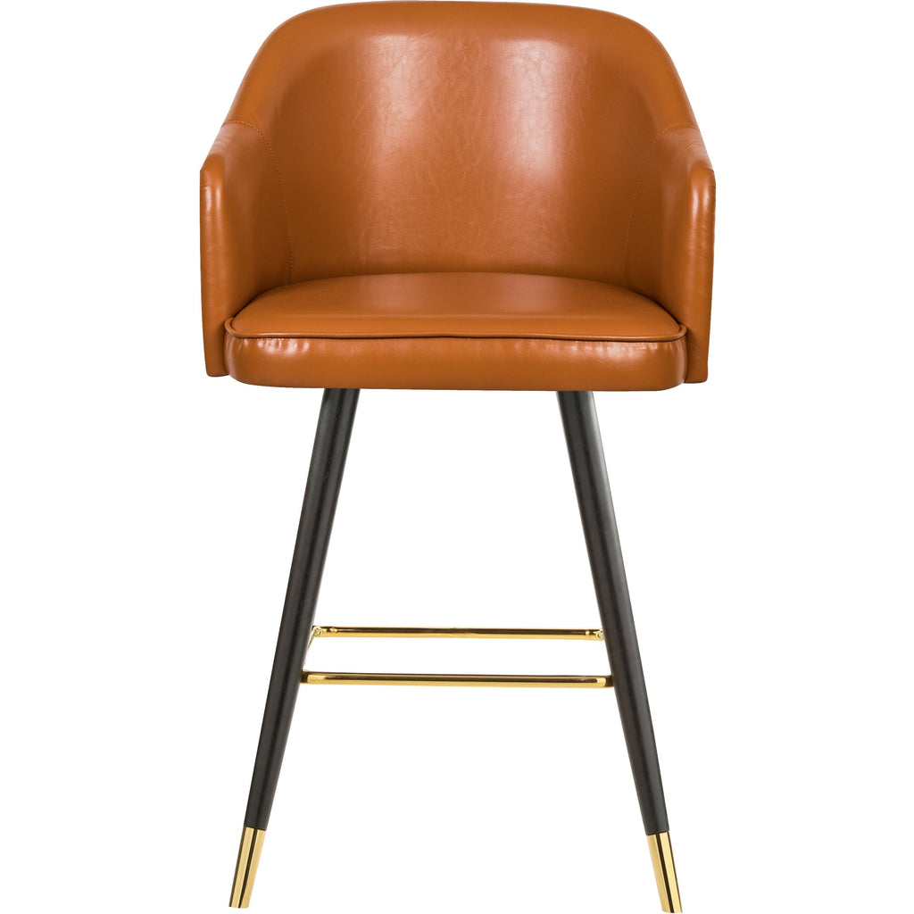 Traditional beauty comes to your home counter area with this Barbosa vegan leather counter stool. The rich, soft cognac vegan leather looks so real, folks will really think it is. The chair rests on matte black metal legs and has a gold footrest with gold caps on its tips for a modish finish. Deep tufting on the back of the seat adds a classic sense of refined style.