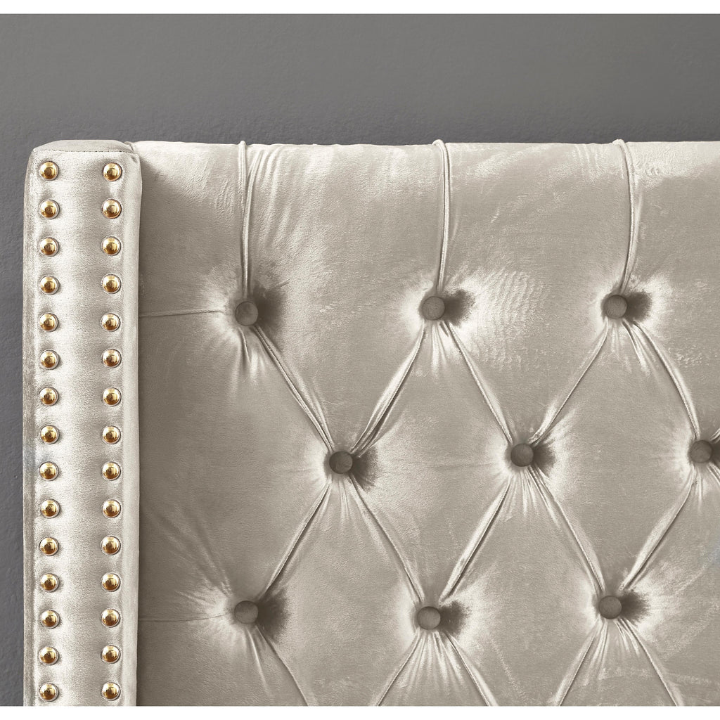 Elegant and eye-catching, the stunning Barolo Bed from Meridian Furniture is the perfect addition to any bedroom. Rich velvet covers the deep tufted design. A beautiful wing bed design is complimented by hand applied gold nail head details. Strength and beauty is guaranteed with a solid wood frame and stainless steel legs.