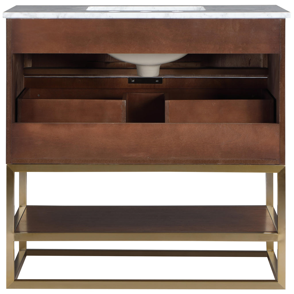 Organize your bathroom while upping your style quotient with this pretty Monad 36-inch bathroom vanity. A must for the contemporary bath, this unit features a rich walnut finish with birch wood veneer and a slatted design that's an instant eye-grabber. The ceramic sink is sized just right to serve it purpose without taking up too much room, and the drawer adds a convenient spot for storing bathroom necessities.