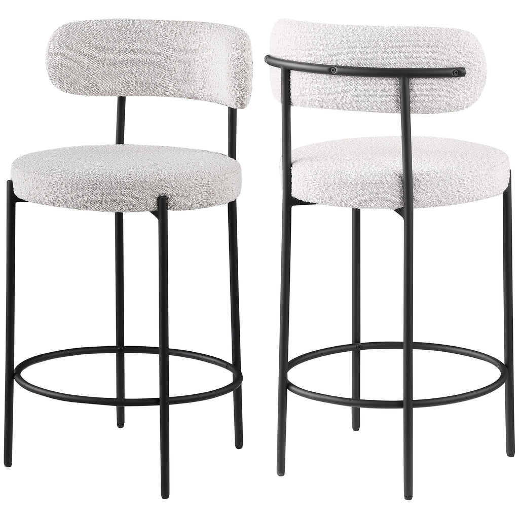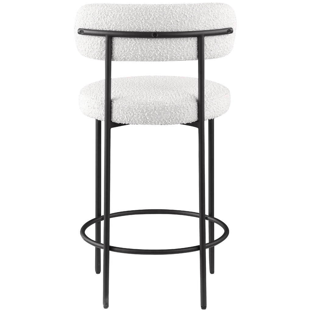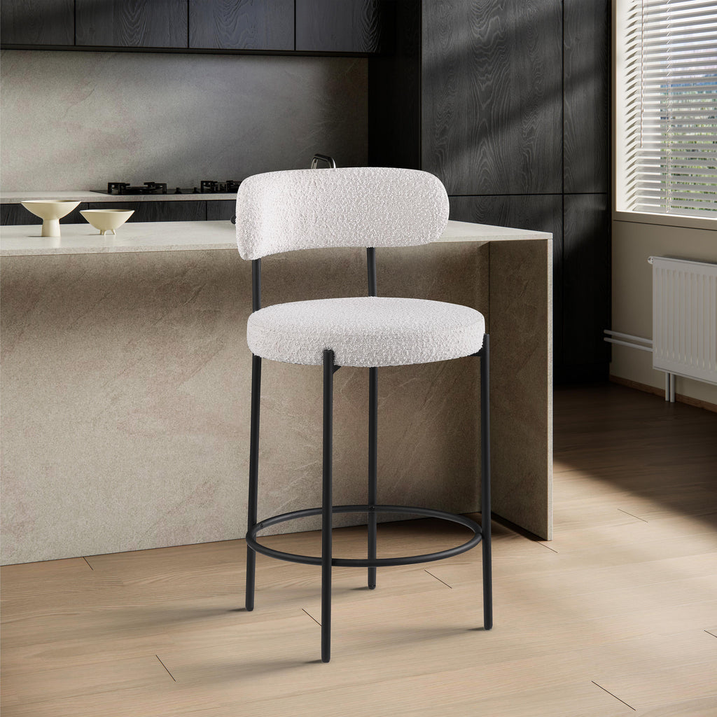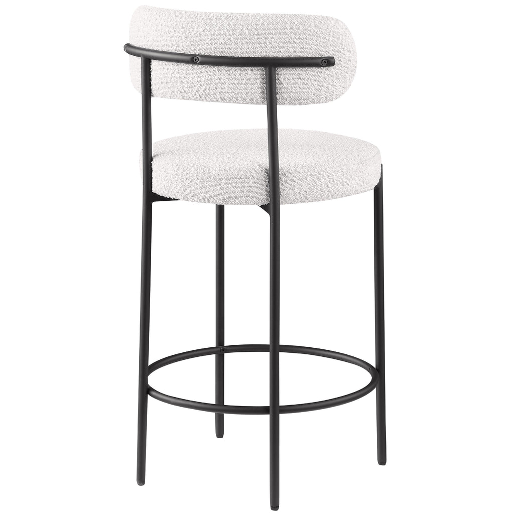 Make family, friends, and guests want to stay 'till closing time when they're seated on these Beacon boucle fabric bar stools/counter stools. These handsome stools are just the thing your kitchen counter or home bar is missing, with their ultra-modern design and beautiful look. The curved backs support the body while you sip a frosty cold one or nosh on some breakfast fare. A matte black metal frame gives the stools' design durability while the cream boucle fabric adds a touch of softness and comfort.
