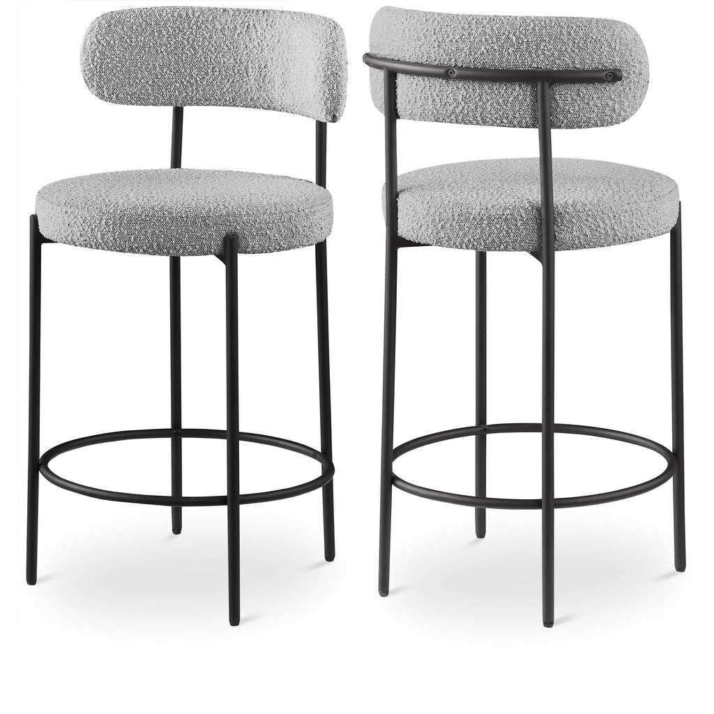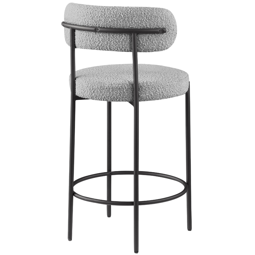 Make family, friends, and guests want to stay 'till closing time when they're seated on these Beacon boucle fabric bar stools/counter stools. These handsome stools are just the thing your kitchen counter or home bar is missing, with their ultra-modern design and beautiful look. The curved backs support the body while you sip a frosty cold one or nosh on some breakfast fare. A matte black metal frame gives the stools' design durability while the grey boucle fabric adds a touch of softness and comfort.