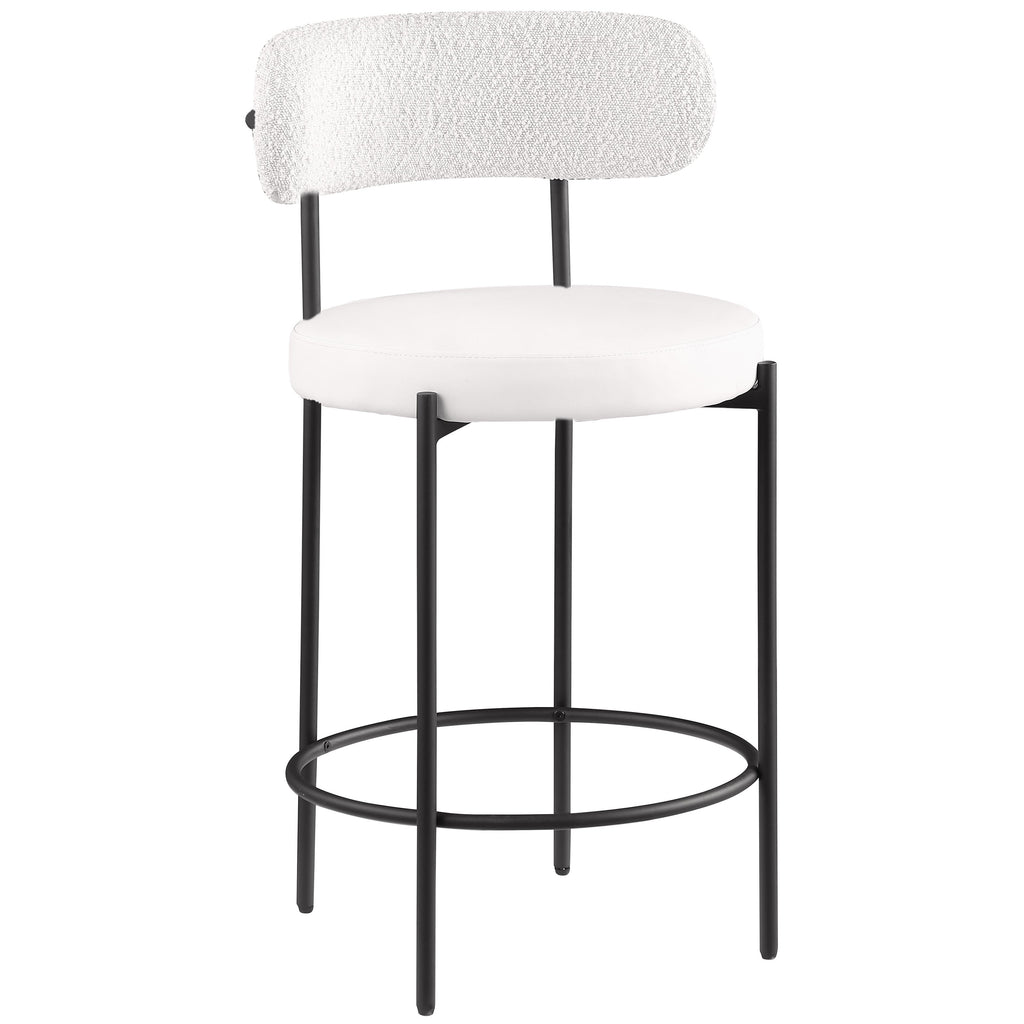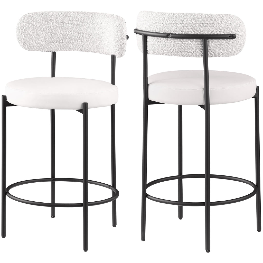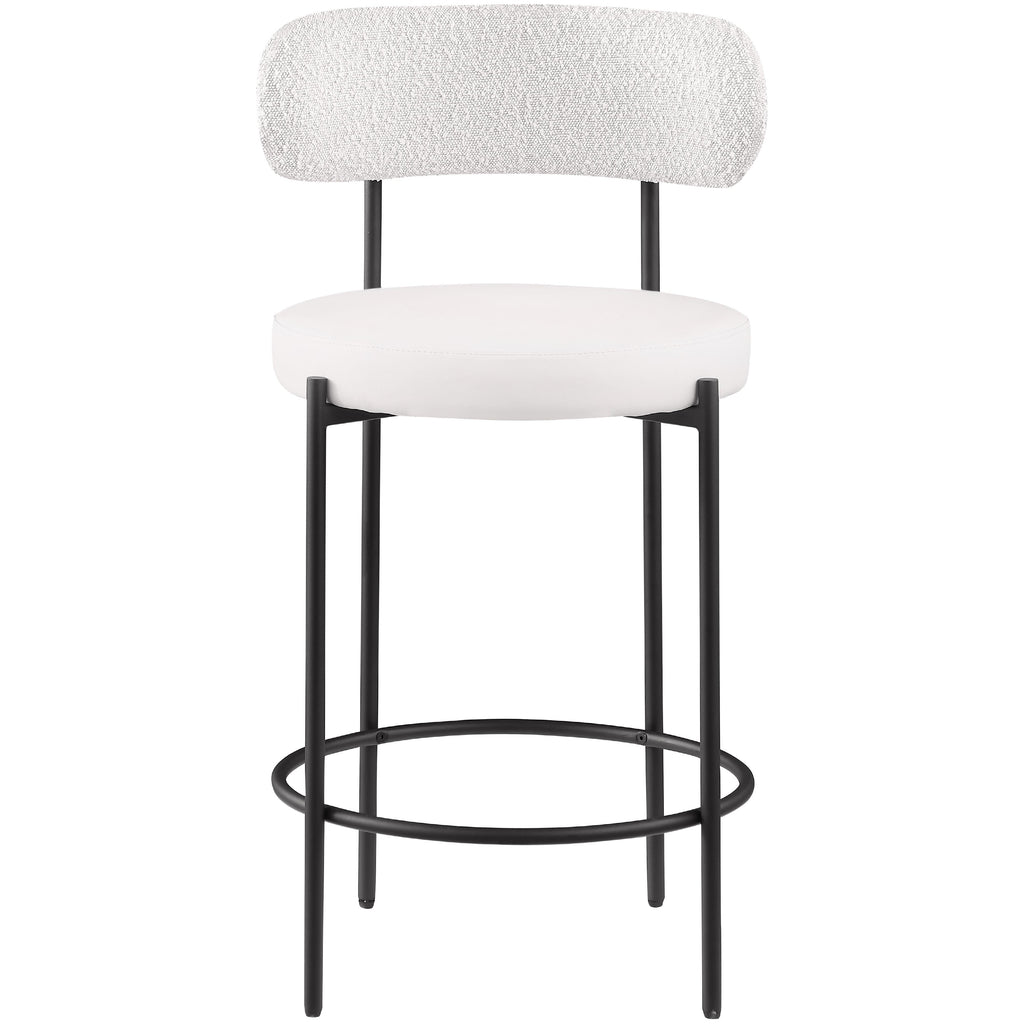 Make family, friends, and guests want to stay 'till closing time when they're seated on these Beacon vegan leather and boucle fabric bar stools/counter stools. These handsome stools are just the thing your kitchen counter or home bar is missing, with their ultra-modern design and beautiful look. The curved backs support the body while you sip a frosty cold one or nosh on some breakfast fare. A matte black metal frame gives the stools' design durability while the cream vegan leather seat and boucle fabric back adds a touch of softness and comfort.