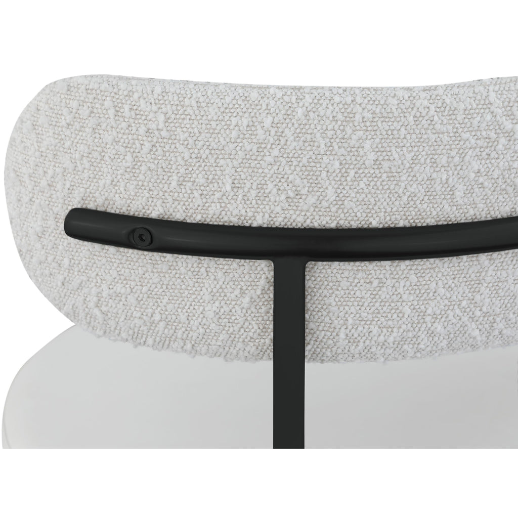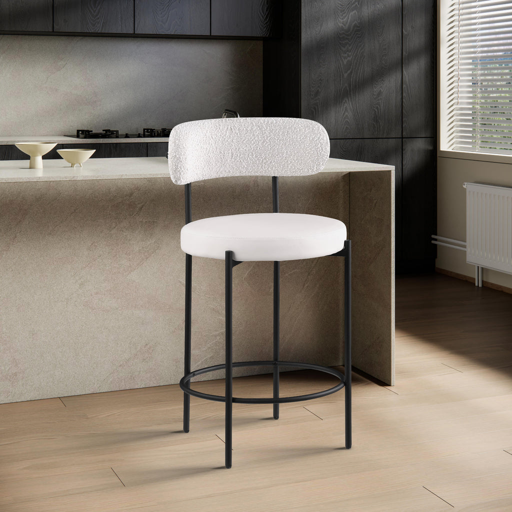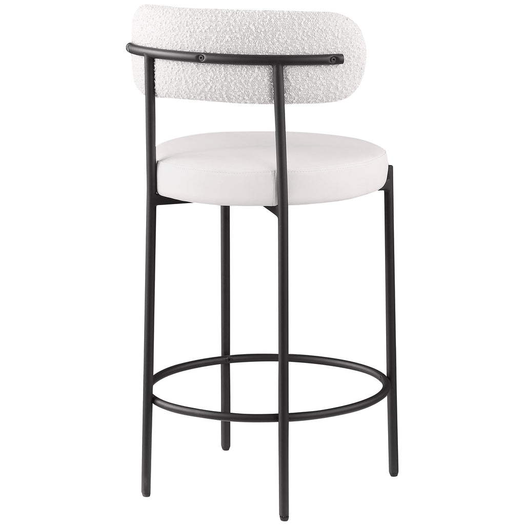 Make family, friends, and guests want to stay 'till closing time when they're seated on these Beacon vegan leather and boucle fabric bar stools/counter stools. These handsome stools are just the thing your kitchen counter or home bar is missing, with their ultra-modern design and beautiful look. The curved backs support the body while you sip a frosty cold one or nosh on some breakfast fare. A matte black metal frame gives the stools' design durability while the cream vegan leather seat and boucle fabric back adds a touch of softness and comfort.