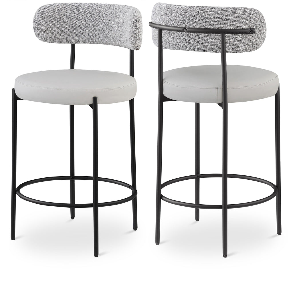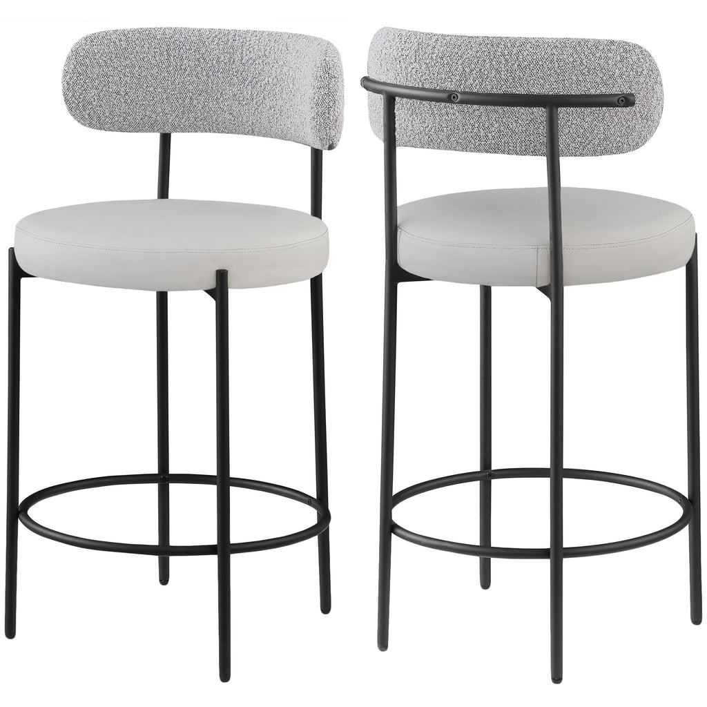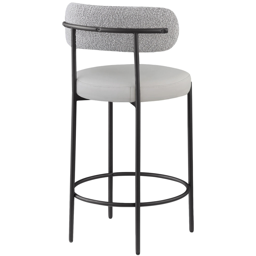 Make family, friends, and guests want to stay 'till closing time when they're seated on these Beacon vegan leather and boucle fabric bar stools/counter stools. These handsome stools are just the thing your kitchen counter or home bar is missing, with their ultra-modern design and beautiful look. The curved backs support the body while you sip a frosty cold one or nosh on some breakfast fare. A matte black metal frame gives the stools' design durability while the taupe vegan leather seat and boucle fabric back adds a touch of softness and comfort.