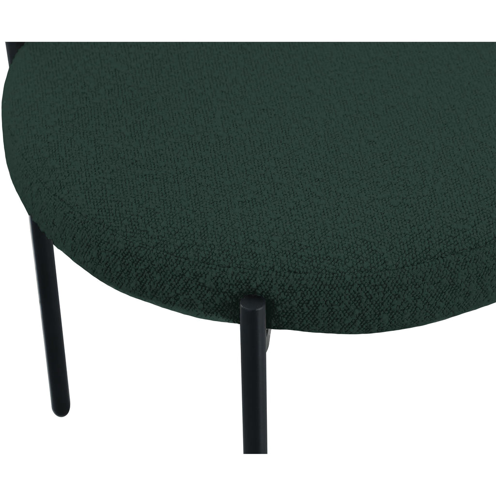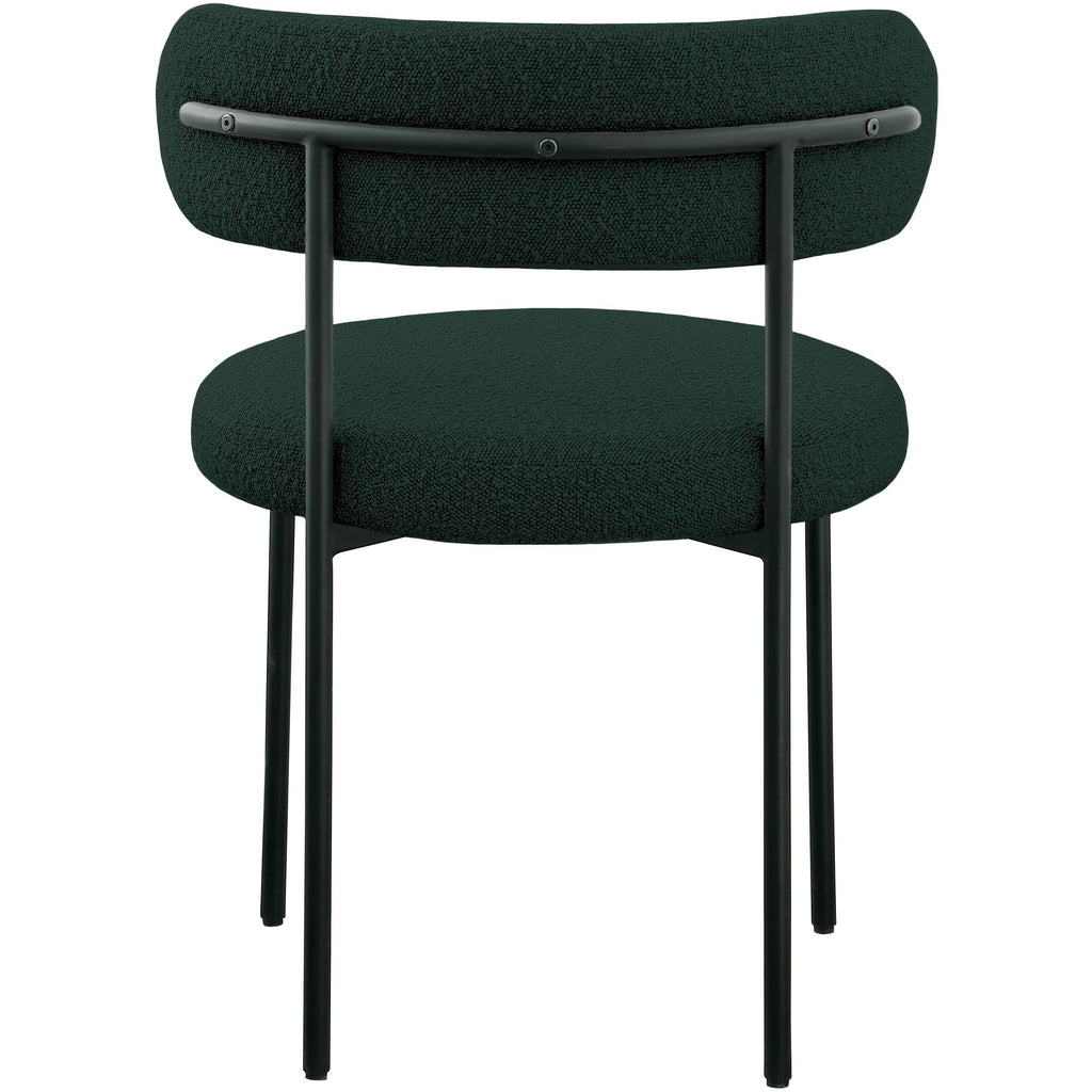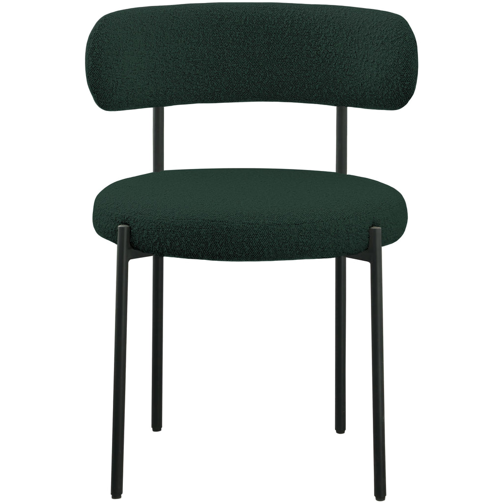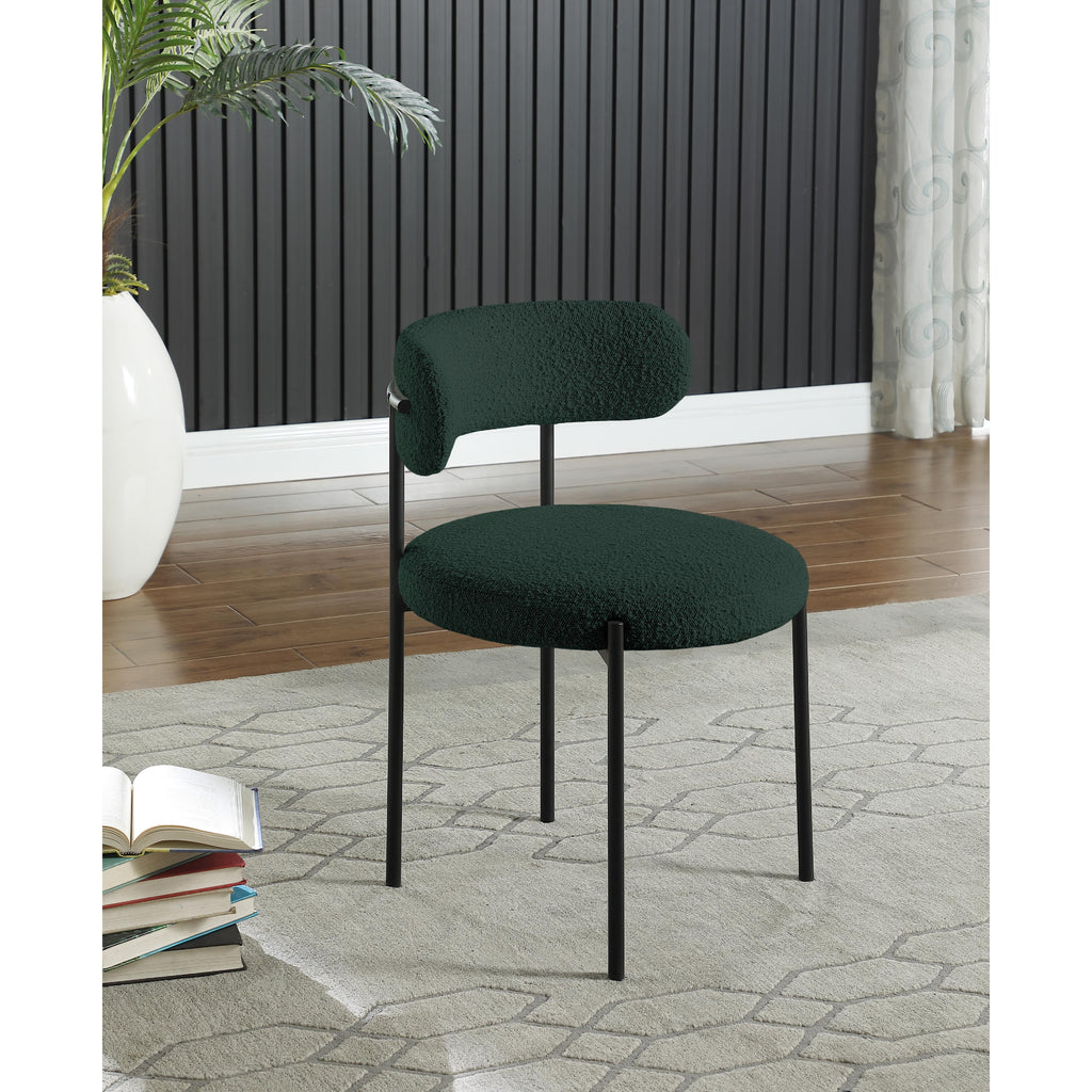 Liven up your dining area with this Beacon green boucle fabric dining chair. Crafted from iron and boucle fabric, this chair is both sturdy and cozy. Its matte green metal frame provides foundational support while its curved seat and backrest provide physical support for those who sit in it. Its rounded appearance gives it a contemporary look perfect for any modern living space. This chair is just the right height to kick back and enjoy your meal.