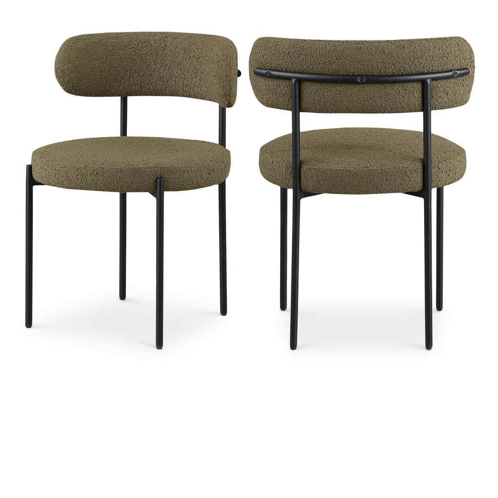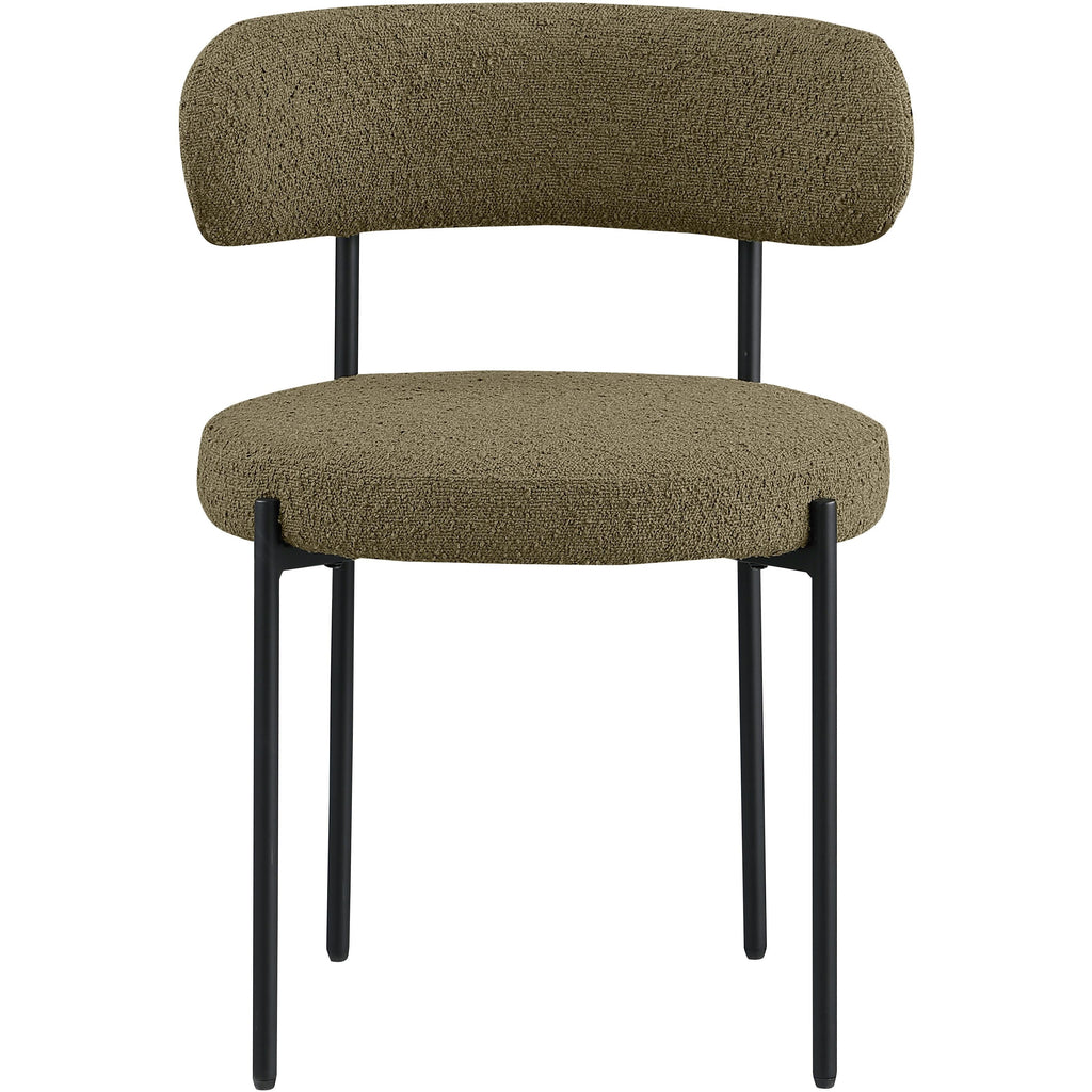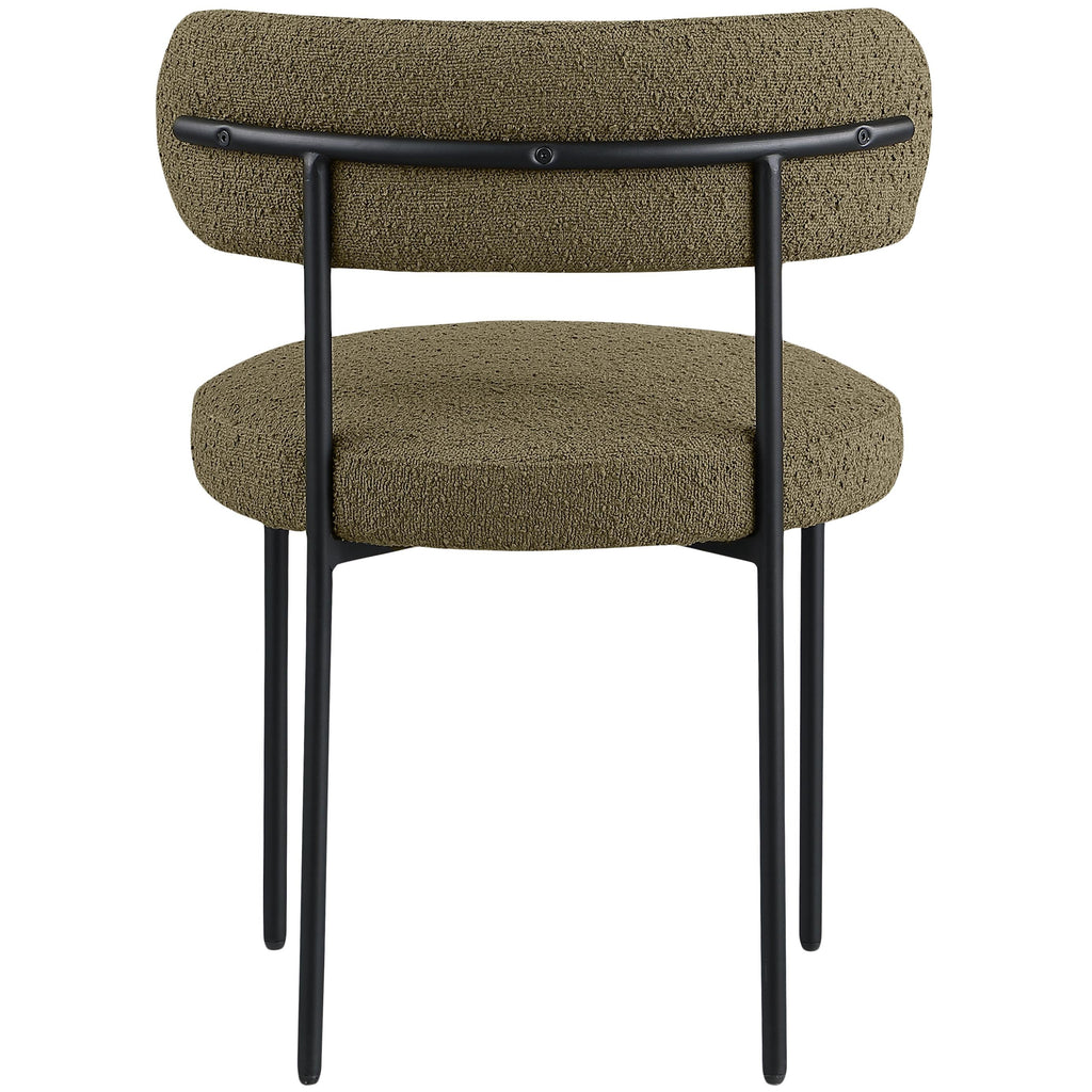 Liven up your dining area with this Beacon olive boucle fabric dining chair. Crafted from iron and boucle fabric, this chair is both sturdy and cozy. Its matte olive metal frame provides foundational support while its curved seat and backrest provide physical support for those who sit in it. Its rounded appearance gives it a contemporary look perfect for any modern living space. This chair is just the right height to kick back and enjoy your meal.