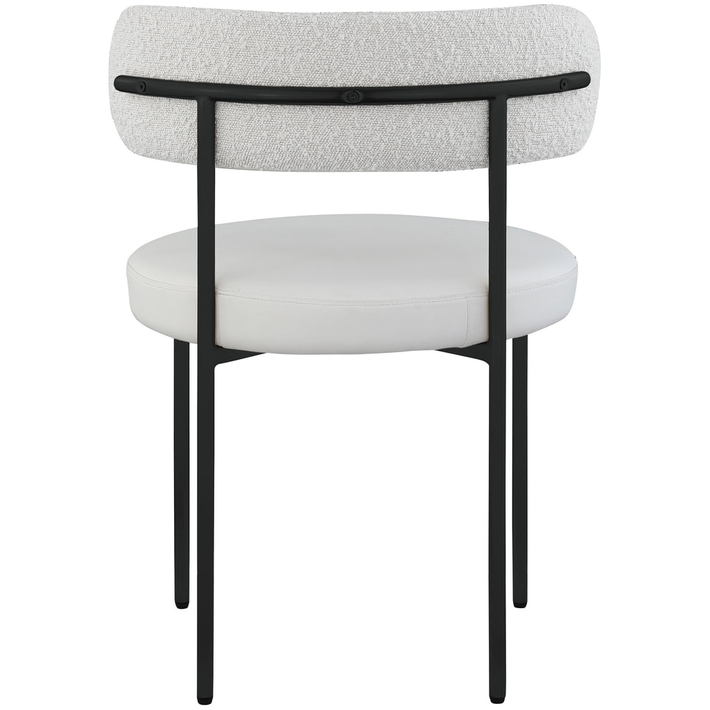 Bring modern comfort to the dining room with this Beacon cream vegan leather and boucle fabric dining chair. Exquisitely designed to be one part utilitarian seat and one part art, this stylish chair turns heads from all angles. The seat comes upholstered in vegan leather for a luxe look while the back is covered in rich cream boucle fabric. The iron metal frame features a matte black finish for an unmistakably modern look.