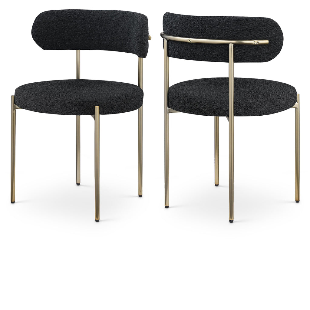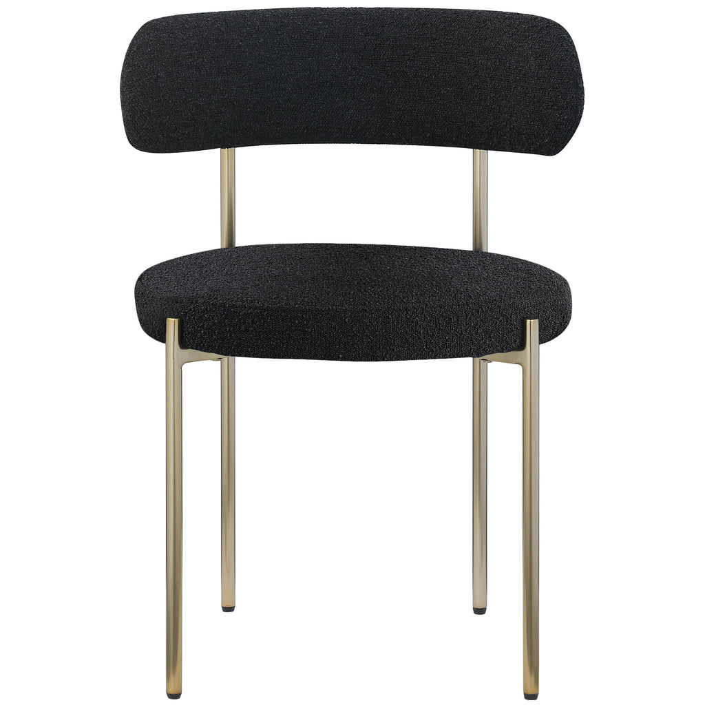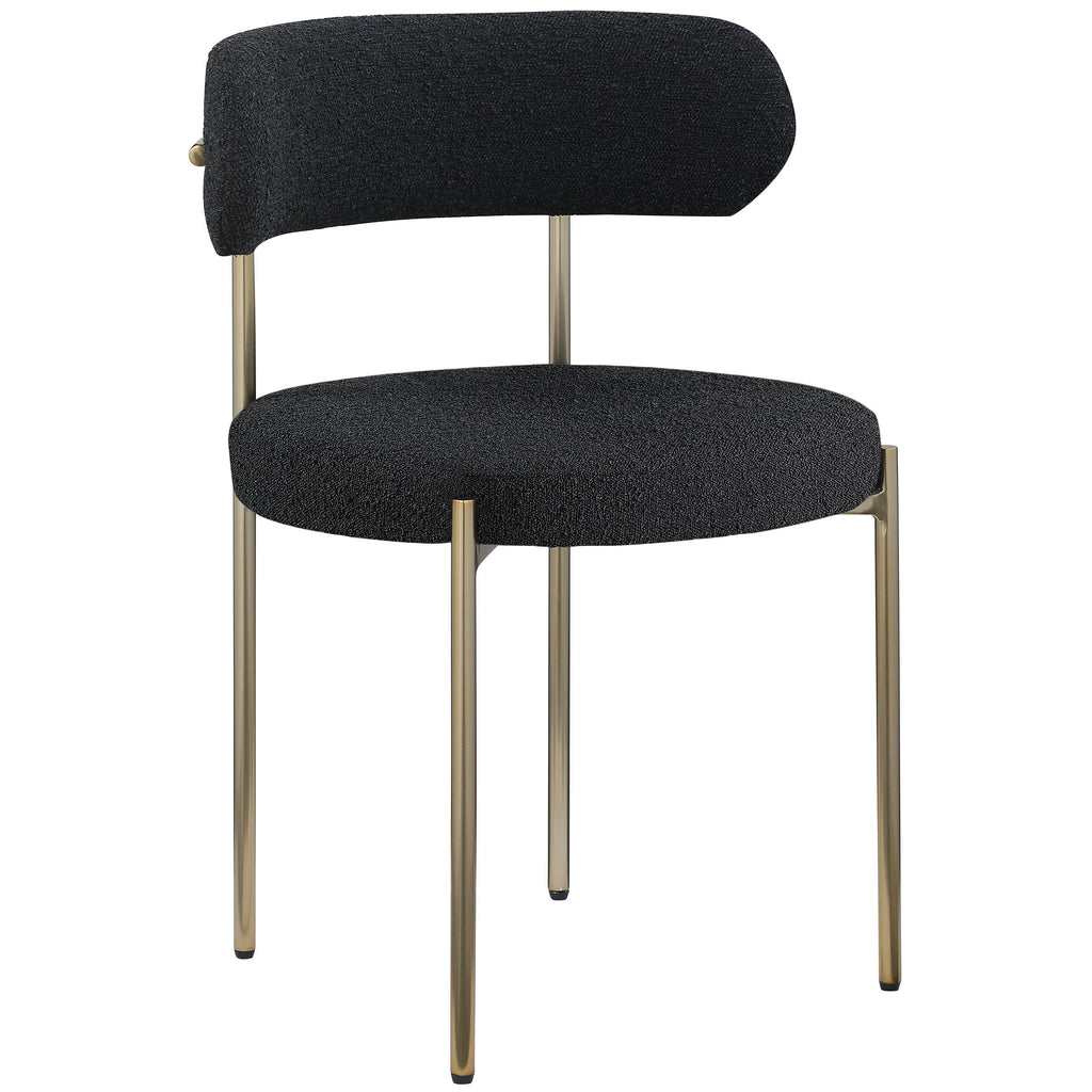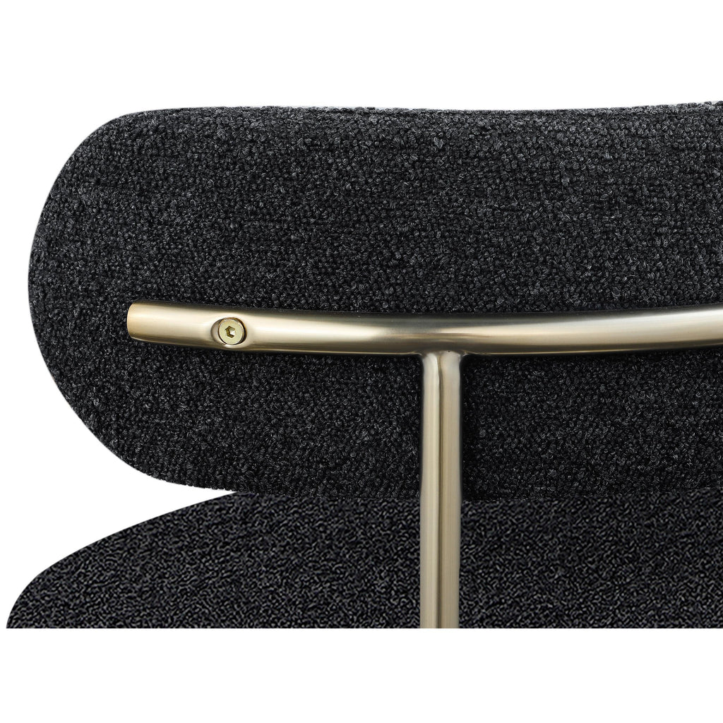 Your dining room gets a brand-new vibe when you bring home this Beacon boucle fabric dining chair. A rounded back makes sitting a pleasure, and the rich black boucle fabric is soft to the touch and feels great against the skin while being easy to maintain. An iron metal frame gives this dining room chair a durable touch, and the brushed brass finish adds a final touch of contemporary beauty. Pair this chair with the table of your choice for a dining room makeover.