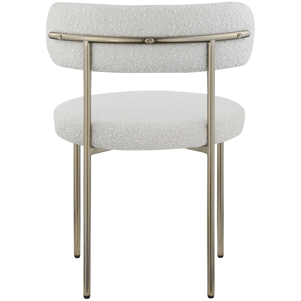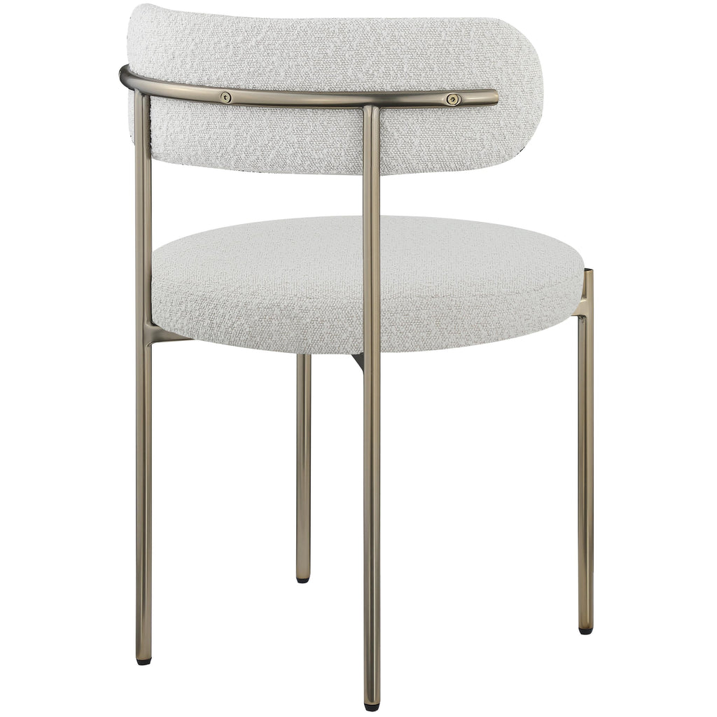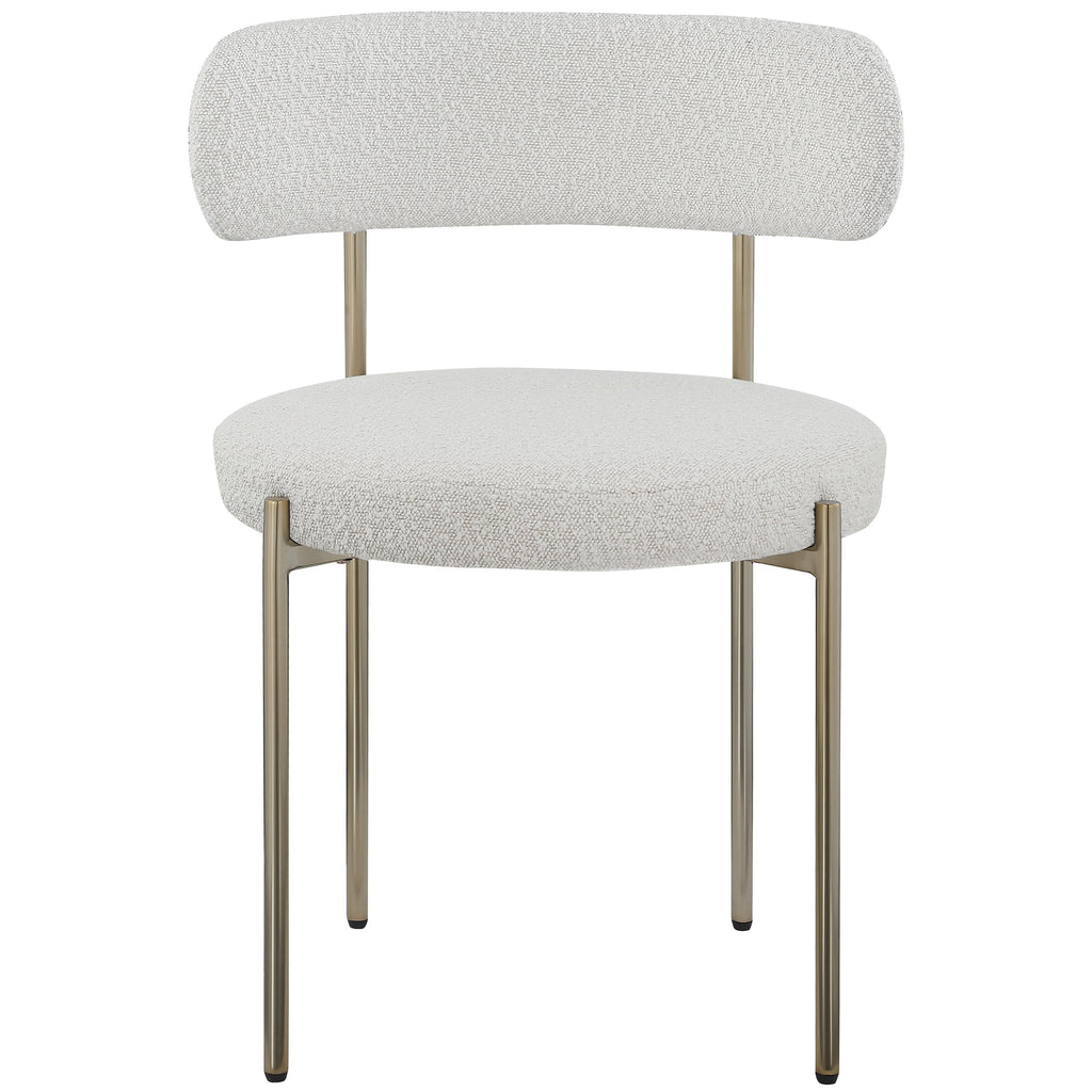 Your dining room gets a brand-new vibe when you bring home this Beacon boucle fabric dining chair. A rounded back makes sitting a pleasure, and the rich cream boucle fabric is soft to the touch and feels great against the skin while being easy to maintain. An iron metal frame gives this dining room chair a durable touch, and the brushed brass finish adds a final touch of contemporary beauty. Pair this chair with the table of your choice for a dining room makeover.