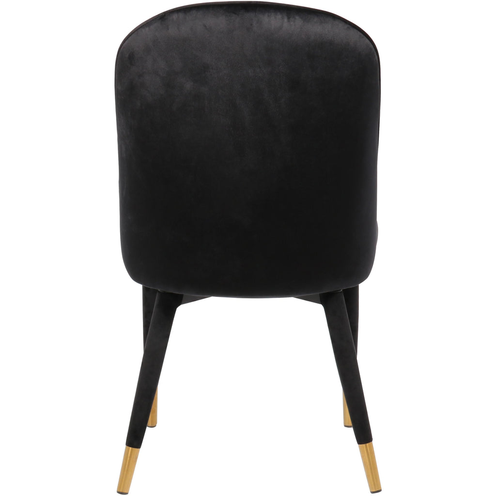 Seat guests in comfort and style in this Belle dining chair. Sumptuously appointed soft black velvet upholstery covers the chair's exterior, adding to its luxurious, upscale look and its soft, sleek feel. Gold tips on the legs of this handsome chair provide a minimal amount of contrast for added visual interest while the curved channel-tufted back cradles guests in comfort, so they want to stay longer. Pair it with other modern elements for an up-to-the-minute look in your room.