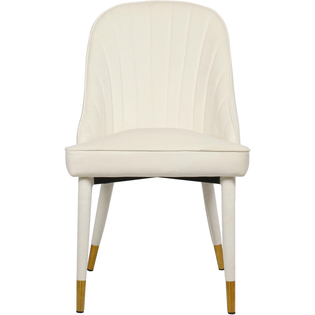 Seat guests in comfort and style in this Belle dining chair. Sumptuously appointed soft cream velvet upholstery covers the chair's exterior, adding to its luxurious, upscale look and its soft, sleek feel. Gold tips on the legs of this handsome chair provide a minimal amount of contrast for added visual interest while the curved channel-tufted back cradles guests in comfort, so they want to stay longer. Pair it with other modern elements for an up-to-the-minute look in your room.