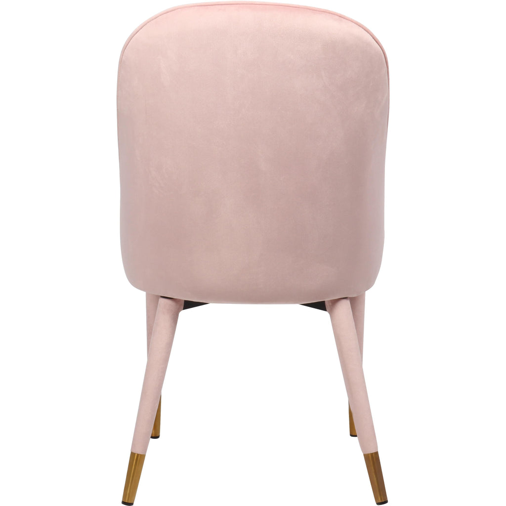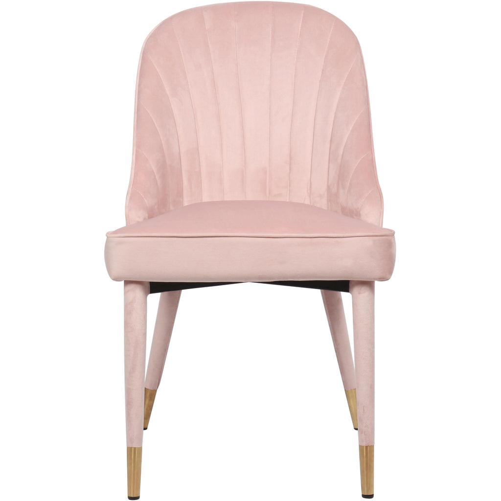 Seat guests in comfort and style in this Belle dining chair. Sumptuously appointed soft pink velvet upholstery covers the chair's exterior, adding to its luxurious, upscale look and its soft, sleek feel. Gold tips on the legs of this handsome chair provide a minimal amount of contrast for added visual interest while the curved channel-tufted back cradles guests in comfort, so they want to stay longer. Pair it with other modern elements for an up-to-the-minute look in your room.