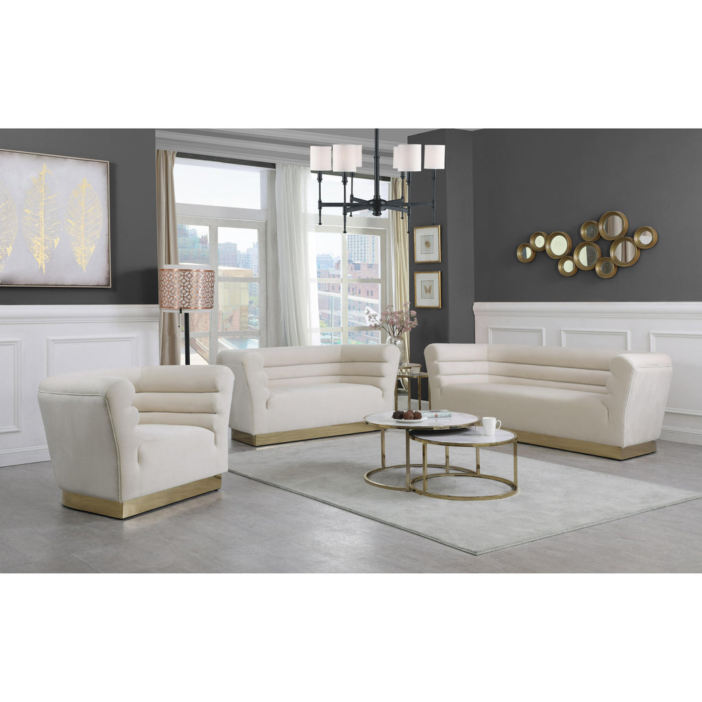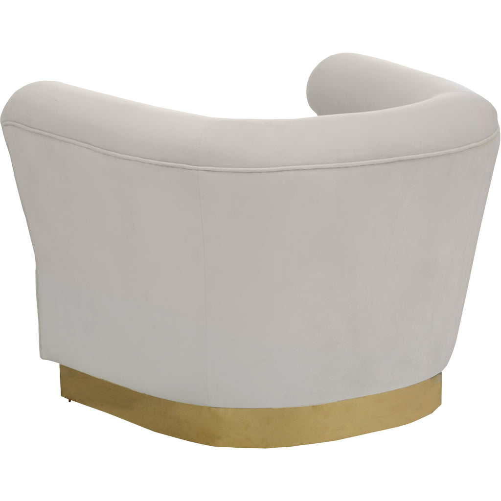 Add a bit of pizzazz to your living space with this Bellini Cream Velvet Chair from Meridian Furniture. Rich cream velvet upholstery offers you a luxurious place to curl up with a good book or rest in front of the TV after a long day, while horizontal channel tufting creates texture and style. Its gold stainless steel base provides solid support, while adding to the chair's contemporary appearance. Its uniquely curved shape makes this piece a perfect addition to any room in your modern home.