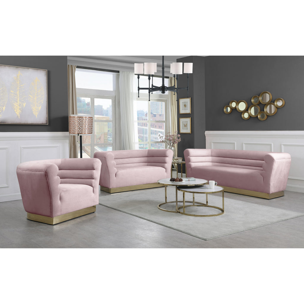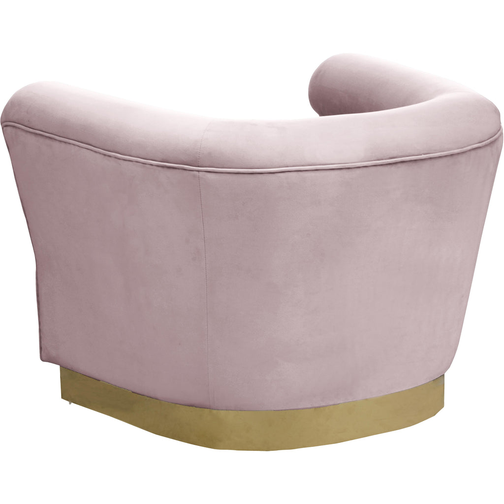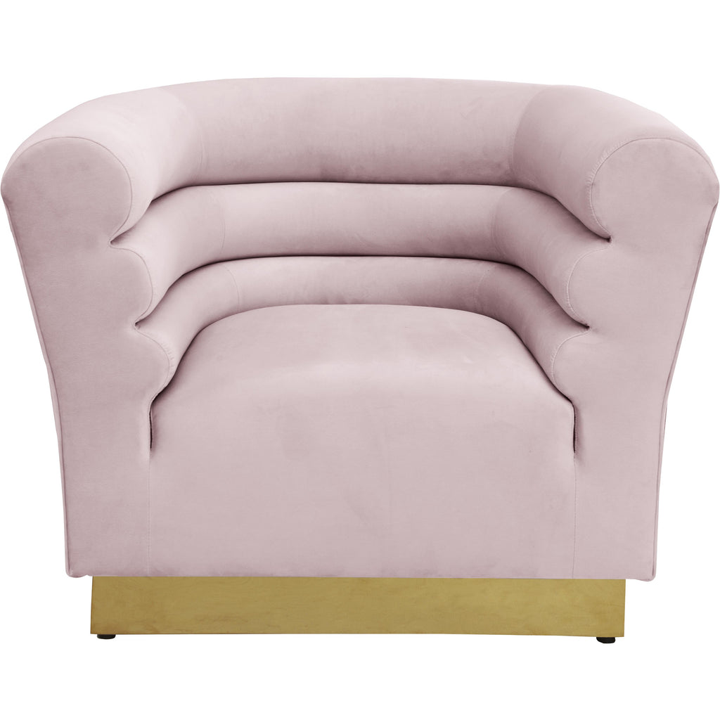 Add a bit of pizzazz to your living space with this Bellini Pink Velvet Chair from Meridian Furniture. Rich pink velvet upholstery offers you a luxurious place to curl up with a good book or rest in front of the TV after a long day, while horizontal Channel tufting creates texture and style. Its gold stainless steel base provides solid support, while adding to the chair's contemporary appearance. Its uniquely curved shape makes this piece a perfect addition to any room in your modern home.