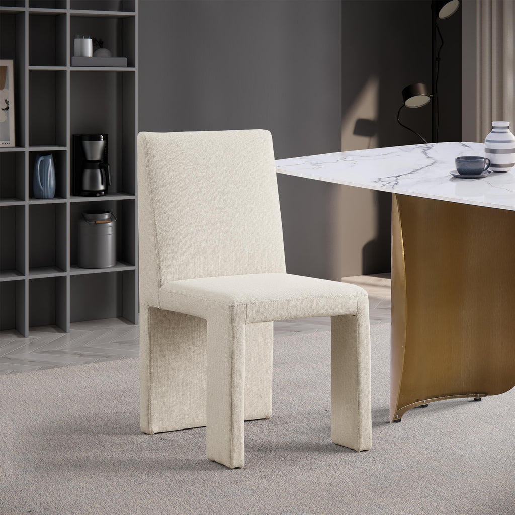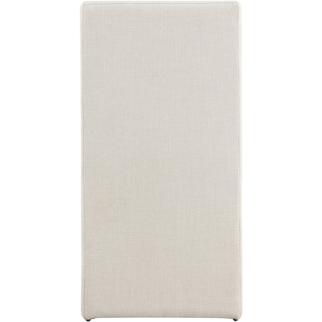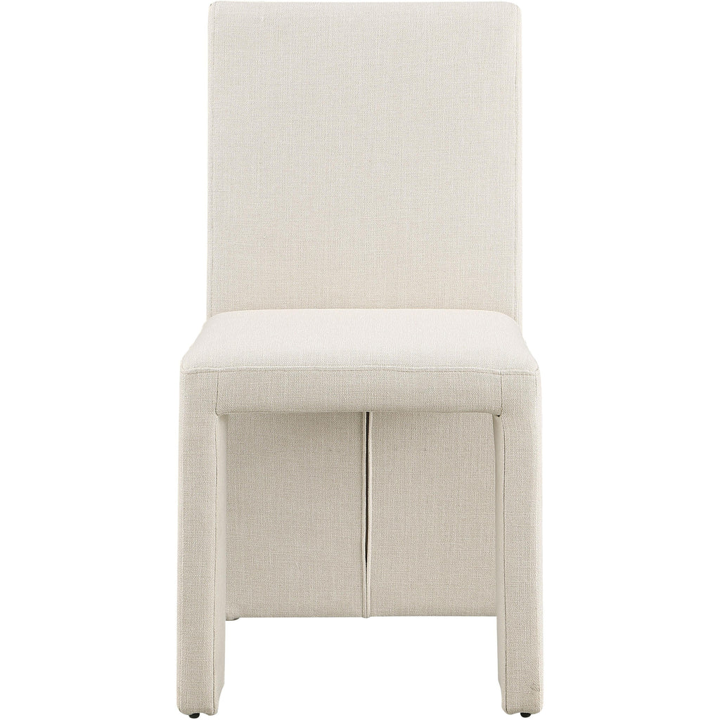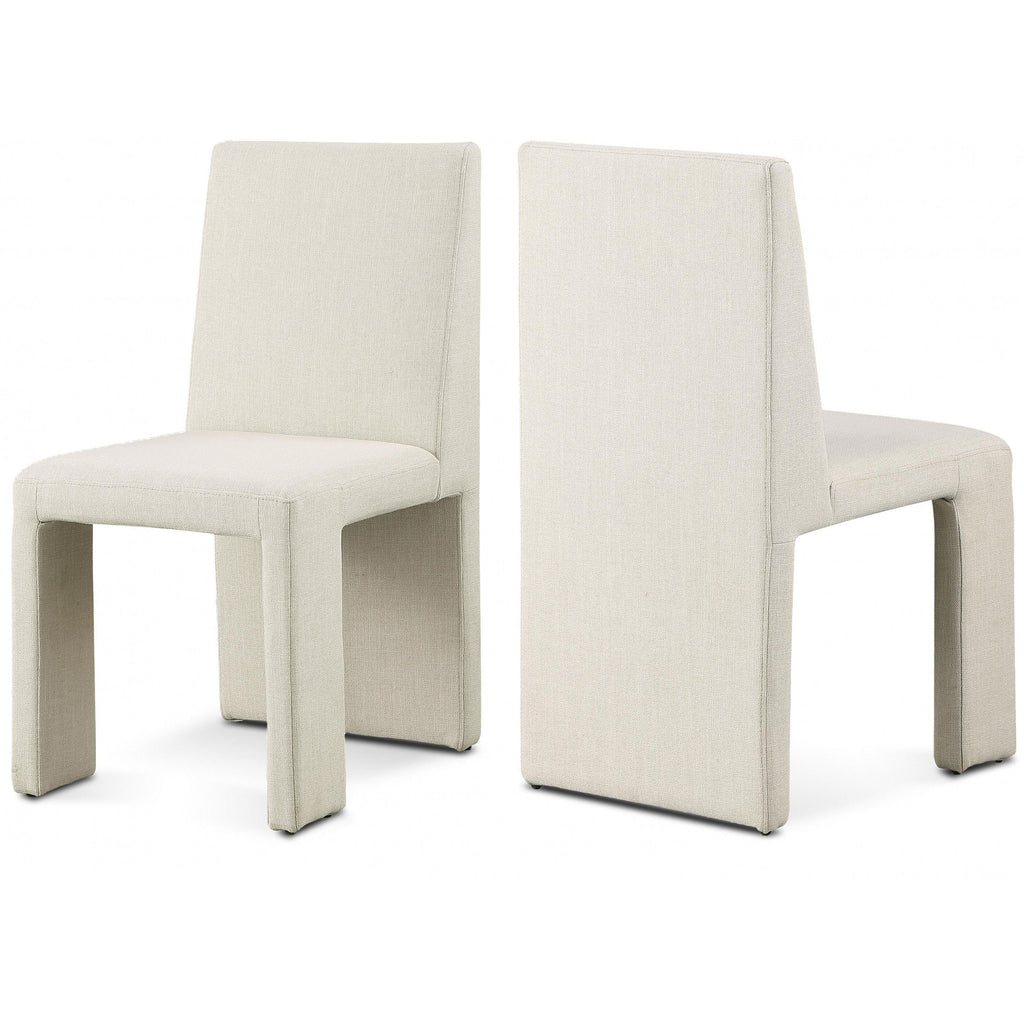 Enhance the ambiance of your dining area with these elegant Benson linen textured fabric dining chairs, which come in a set of two. Featuring a plush beige upholstery with a subtle white weave, these chairs are the perfect addition to your dining room makeover. The chairs' sturdy iron inner frame ensures durability and complements their art deco design, while their armless and floor-length backs add a touch of sophistication to your dining space, making it ideal for both casual meals and formal occasions. Bring a touch of style and comfort to your dining area with these beautiful chairs.