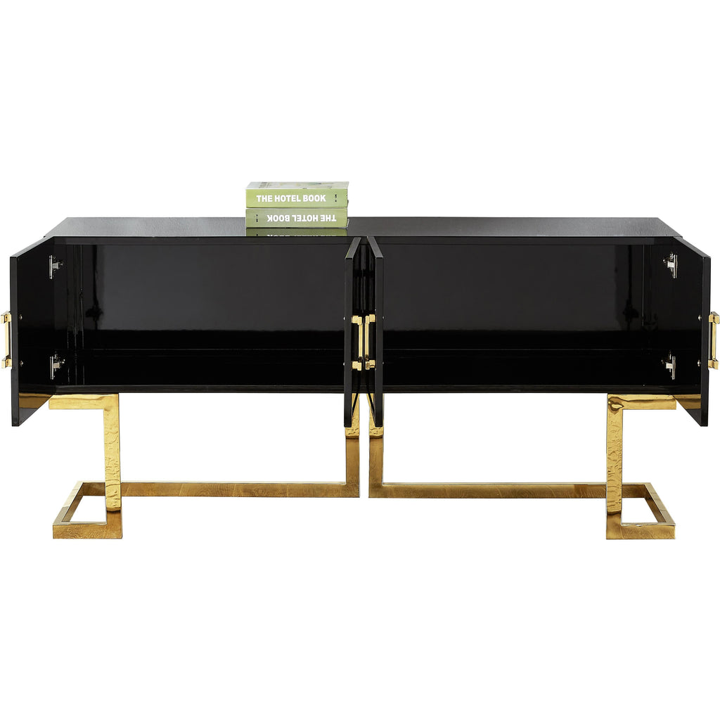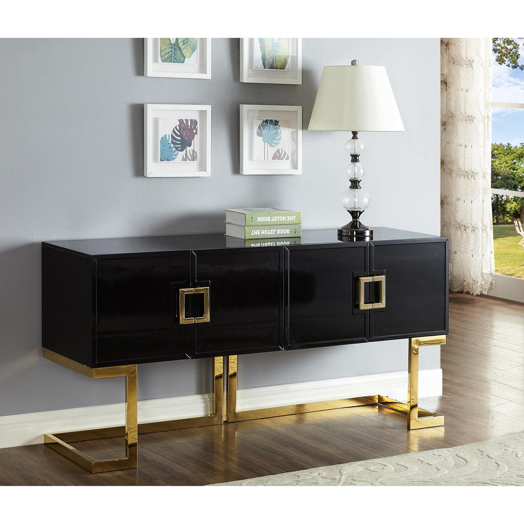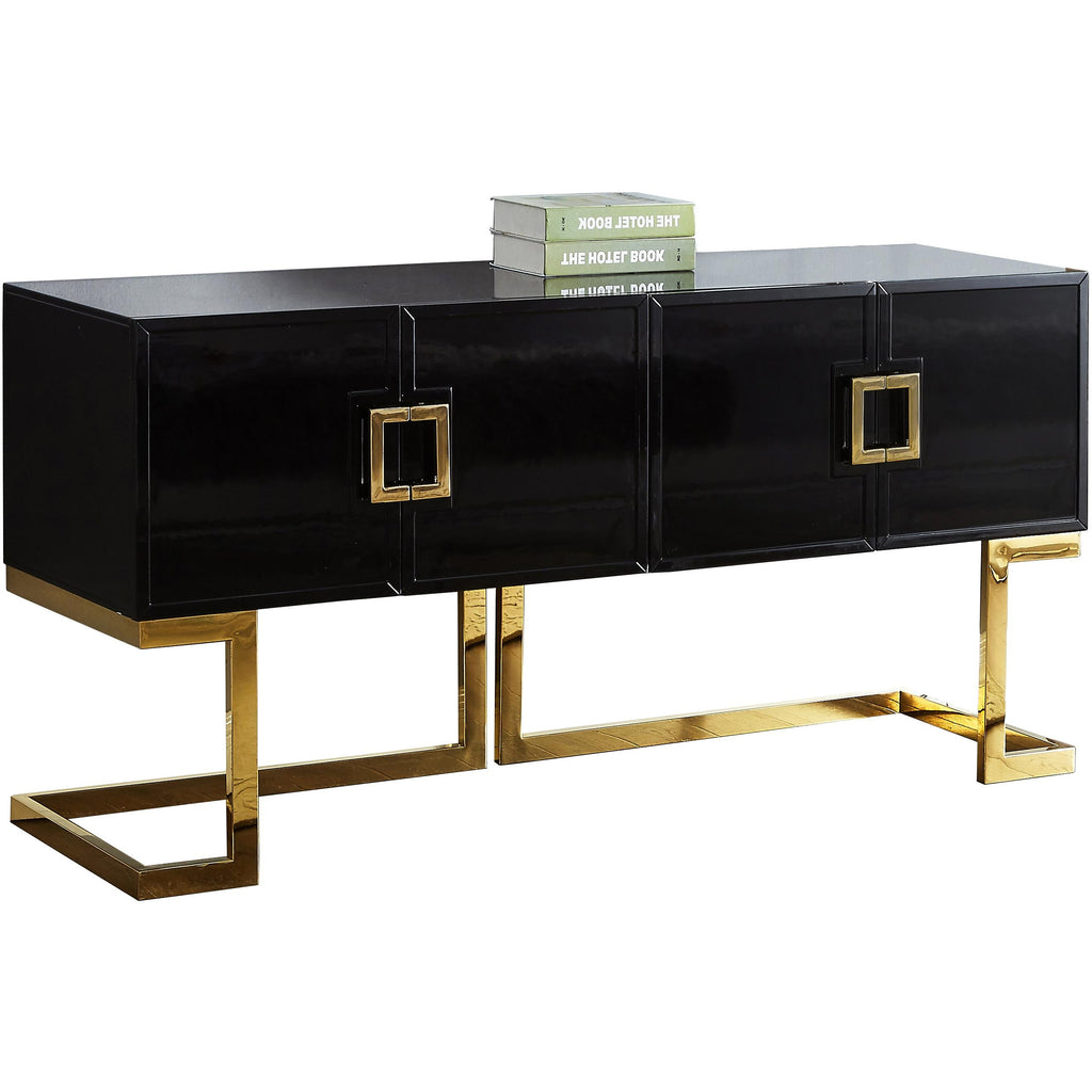 Ensure the items you need at mealtime are close at hand with this handsome Beth Sideboard Buffet from Meridian Furniture. This indispensable piece is a modern marvel with its contemporary design featuring black lacquer with a gold stainless steel trim and base. Open the doors to reveal a large area that's suitable for storing everything from serving bowls to out-of-season dinnerware.