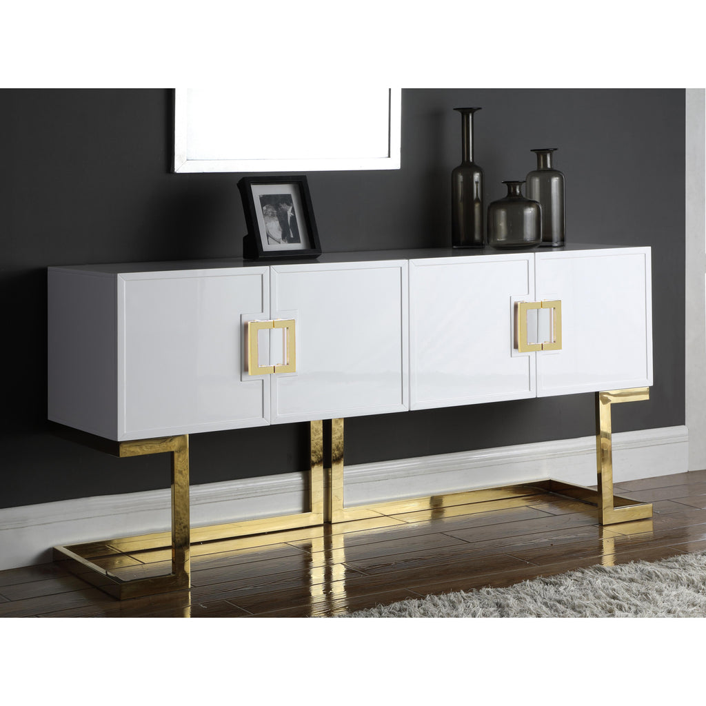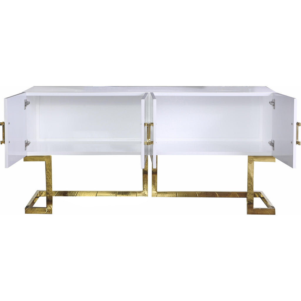 Ensure the items you need at mealtime are close at hand with this handsome Beth Sideboard Buffet from Meridian Furniture. This indispensable piece is a modern marvel with its contemporary design featuring white lacquer with a gold stainless steel trim and base. Open the doors to reveal a large area that's suitable for storing everything from serving bowls to out-of-season dinnerware.