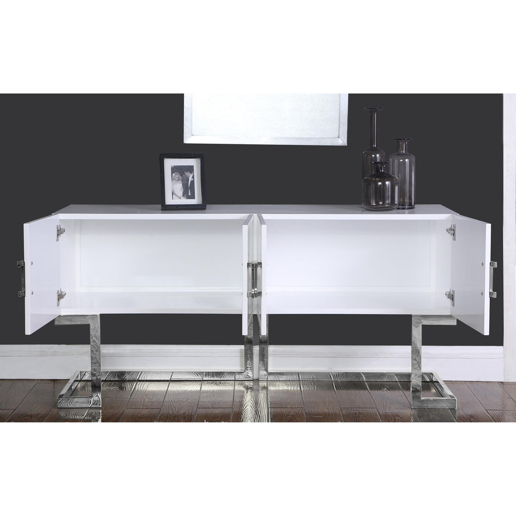 Ensure the items you need at mealtime are close at hand with this handsome Beth Sideboard Buffet from Meridian Furniture. This indispensable piece is a modern marvel with its contemporary design featuring white lacquer with a chrome stainless steel trim and base. Open the doors to reveal a large area that's suitable for storing everything from serving bowls to out-of-season dinnerware.