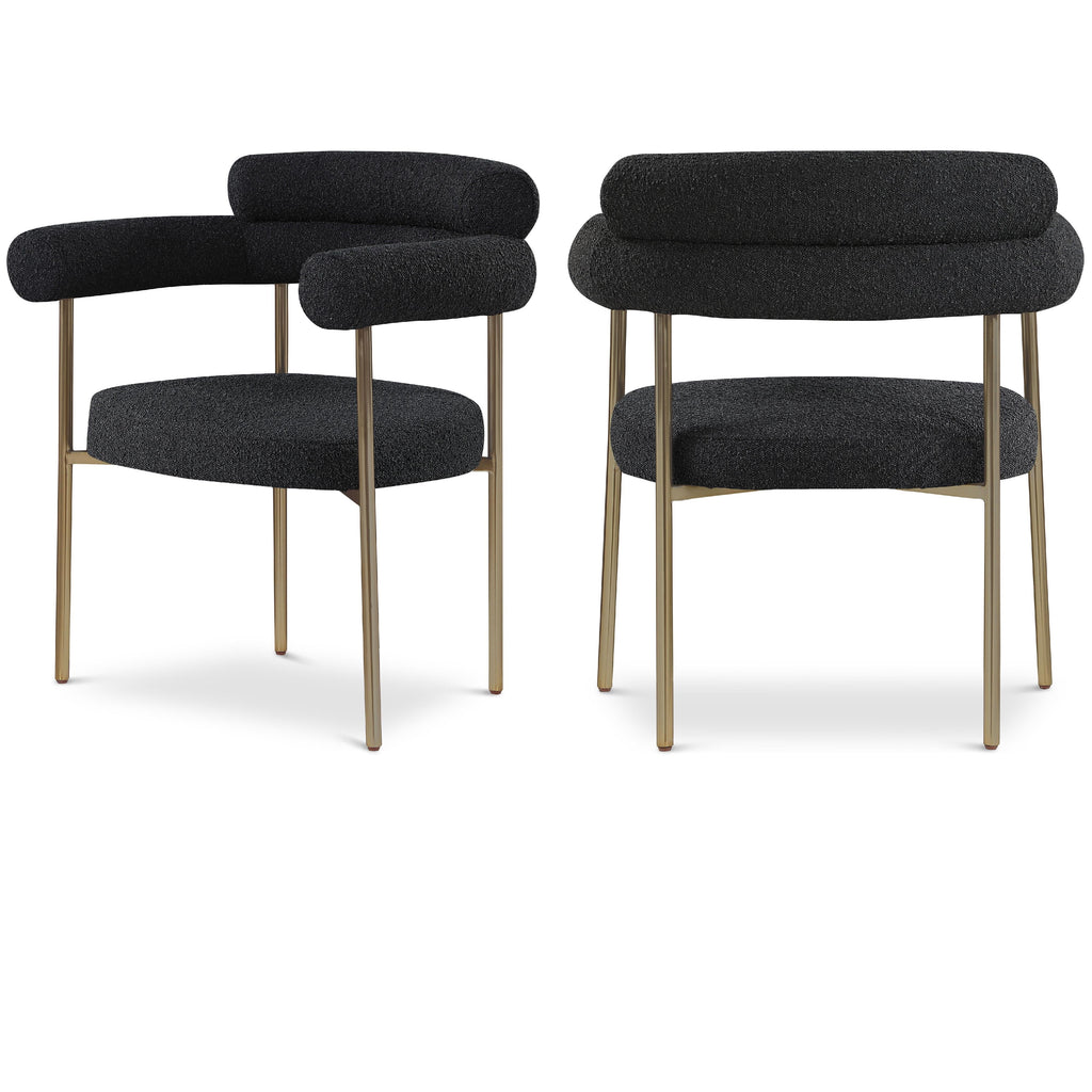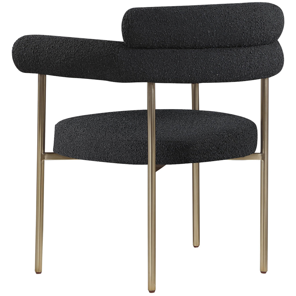 Comfort comes to mealtime with this Blake boucle fabric dining chair. This lovely chair is just the right choice for your modern dining room, with its curved back that cradles you in comfort while you wine and dine the night away. A thickly padded soft black boucle fabric seat lends this chair a sleek, upscale look while ensuring its ongoing performance and beauty. The chair's brushed brass finish protects its all-metal iron frame.