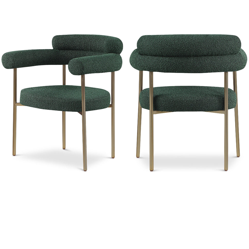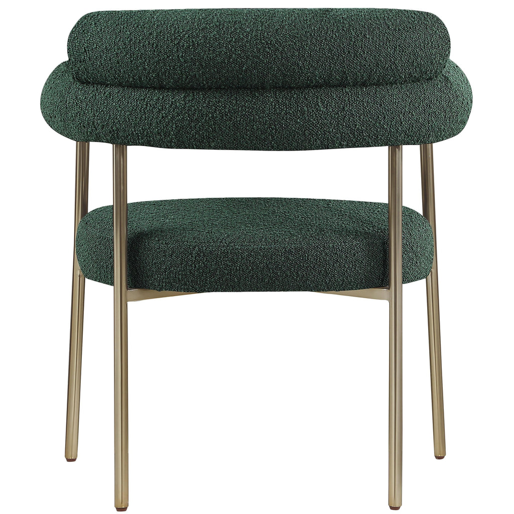 Comfort comes to mealtime with this Blake boucle fabric dining chair. This lovely chair is just the right choice for your modern dining room, with its curved back that cradles you in comfort while you wine and dine the night away. A thickly padded soft green boucle fabric seat lends this chair a sleek, upscale look while ensuring its ongoing performance and beauty. The chair's brushed brass finish protects its all-metal iron frame.