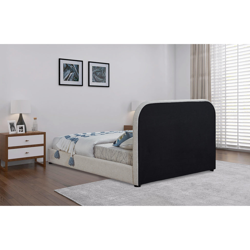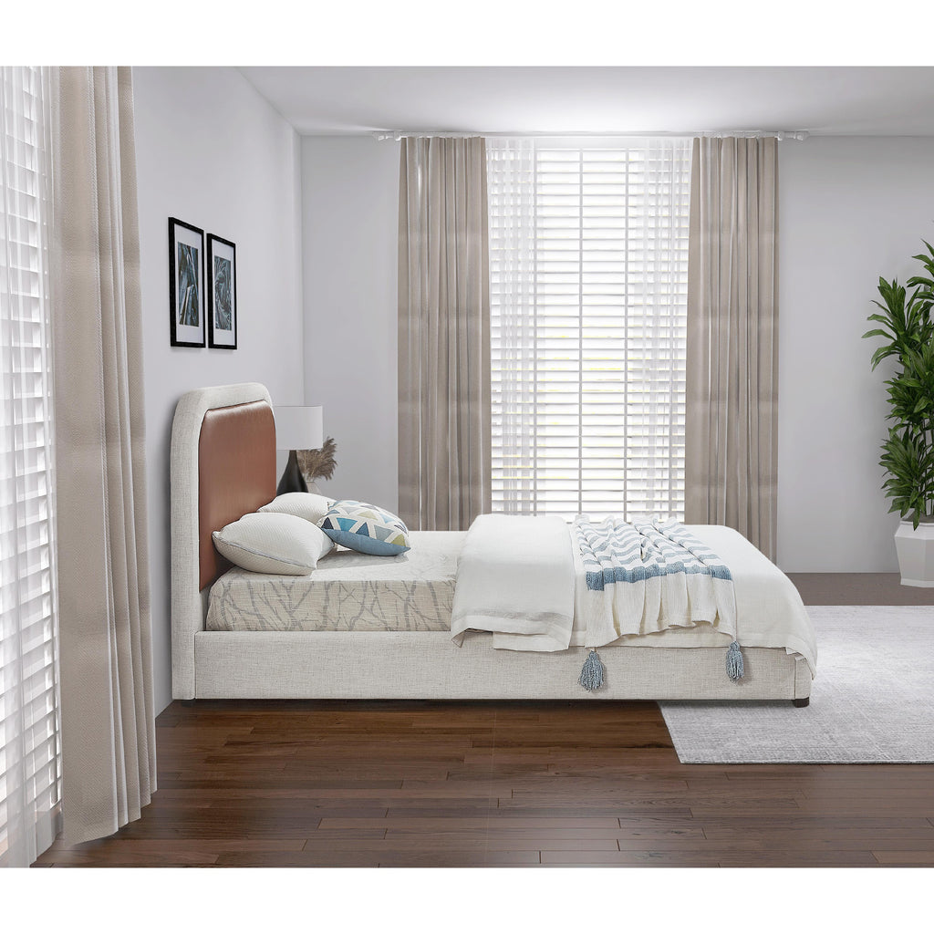 Create a dreamy look in your modern bedroom with this Blake bed. This king-sized bed offers a heavily padded soft brown vegan leather headboard that's inviting to the upper body as you recline in bed to read a book or watch TV. The bed's frame comes covered in rich cream linen-like fabric for a contrasting look that's well-received in contemporary bedroom spaces. Full slats are included, so there's no need to add a box spring.