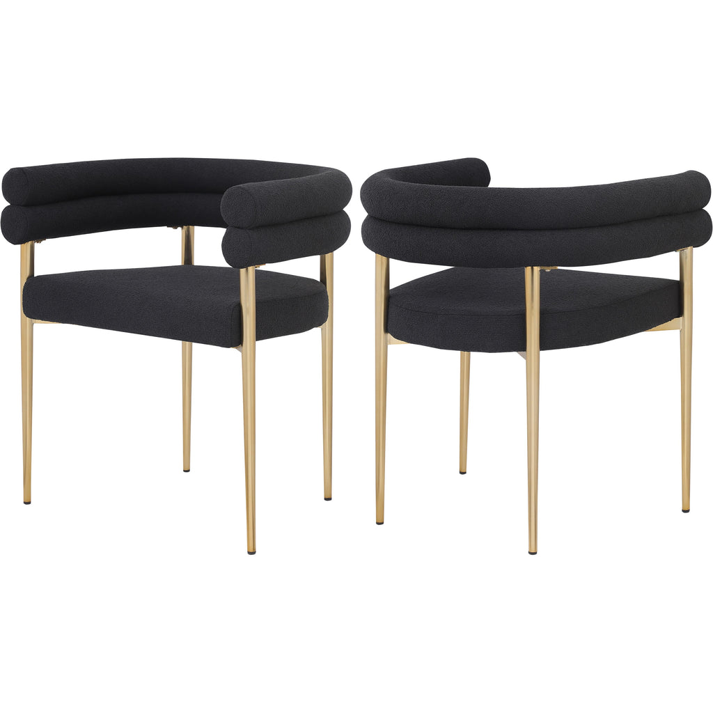 Bring boldness to your dining area with this Brielle dining chair from Meridian Furniture. Its curved, brushed gold metal frame provides support for its rich black boucle seat and backrest, giving it contrasting colors as well as offering a comfortable place for you to sit. Crafted out of iron and foam and upholstered with boucle fabric, this stunning dining chair is both sturdy and durable, making it a staple in your home for years to come.