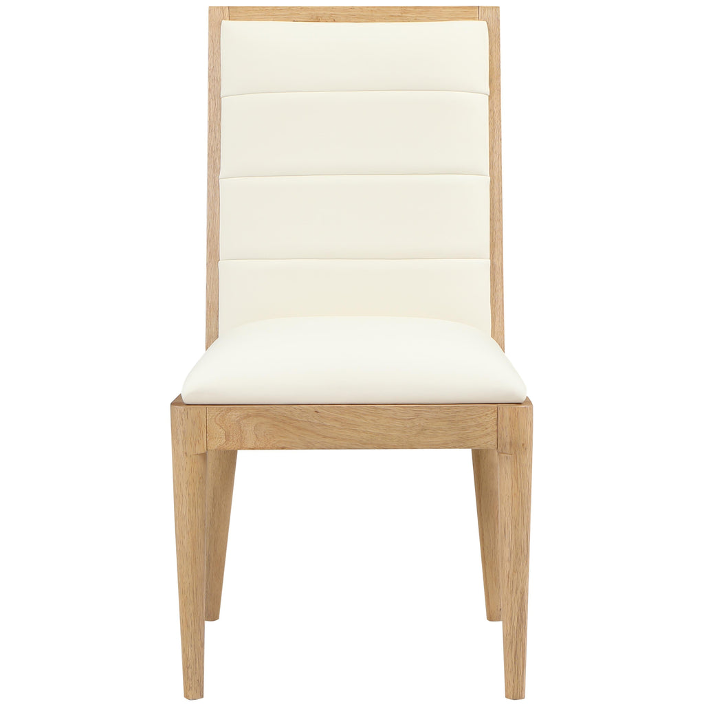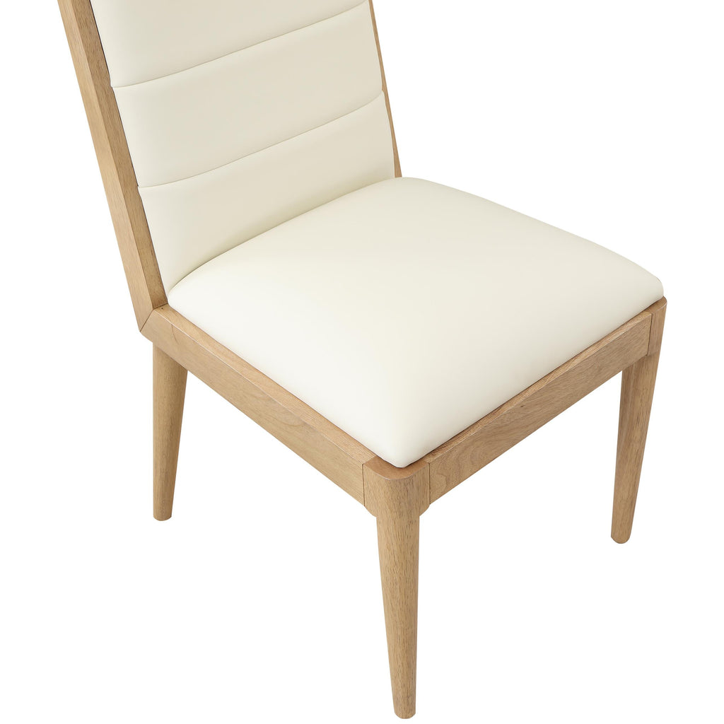 Rehab your dining room with these beautifully modern Bristol vegan leather dining chairs. Soft cream vegan leather is the star of the show when it comes to this Bristol chair, giving you the rich, upscale look of leather without the added care requirements of the real thing. Channel tufting on the chair's back adds visual and textural interest while keeping the padding inside aloft and preventing shifting. A wood frame in a contrasting woodgrain adds contrast and ensures this dining chair is a showstopper.