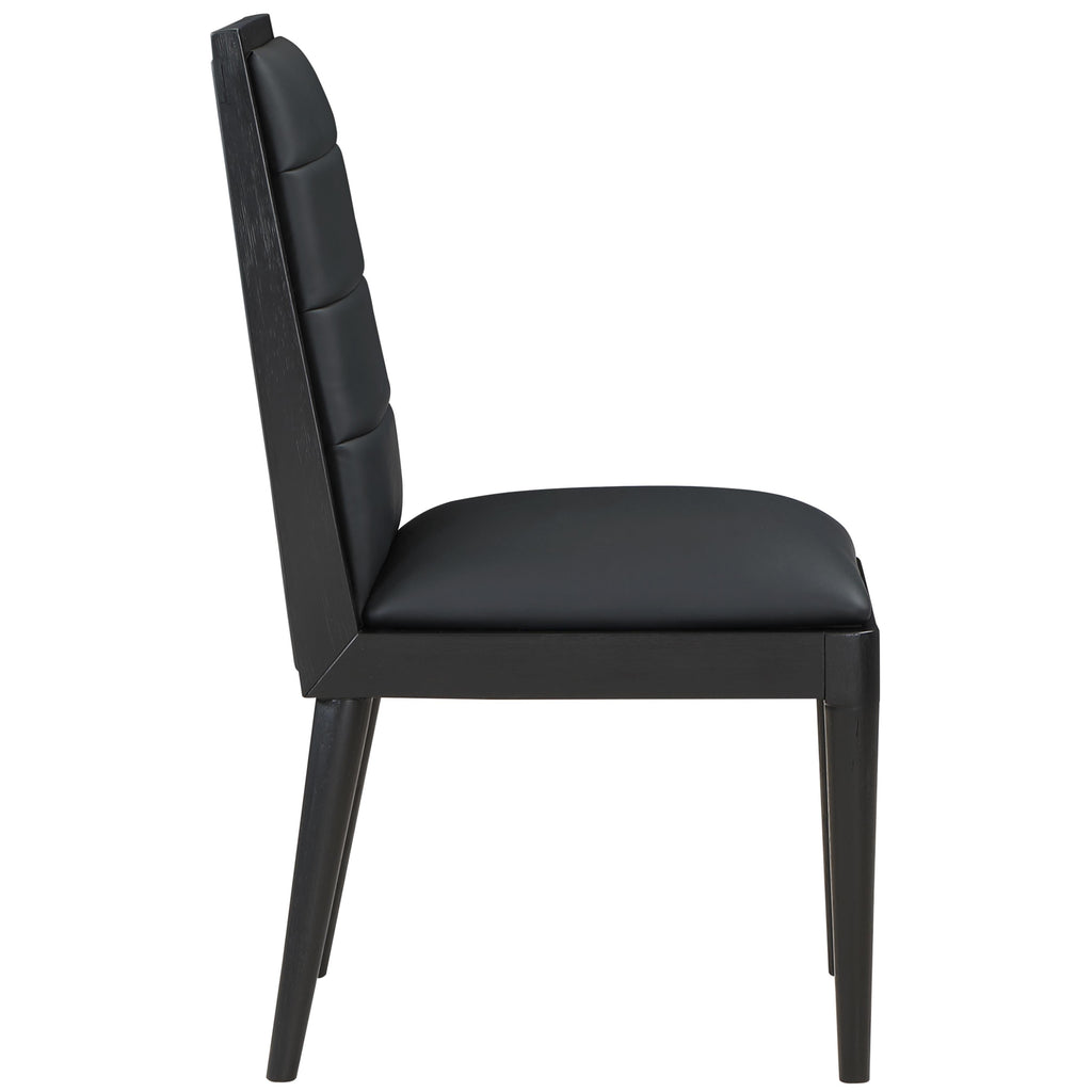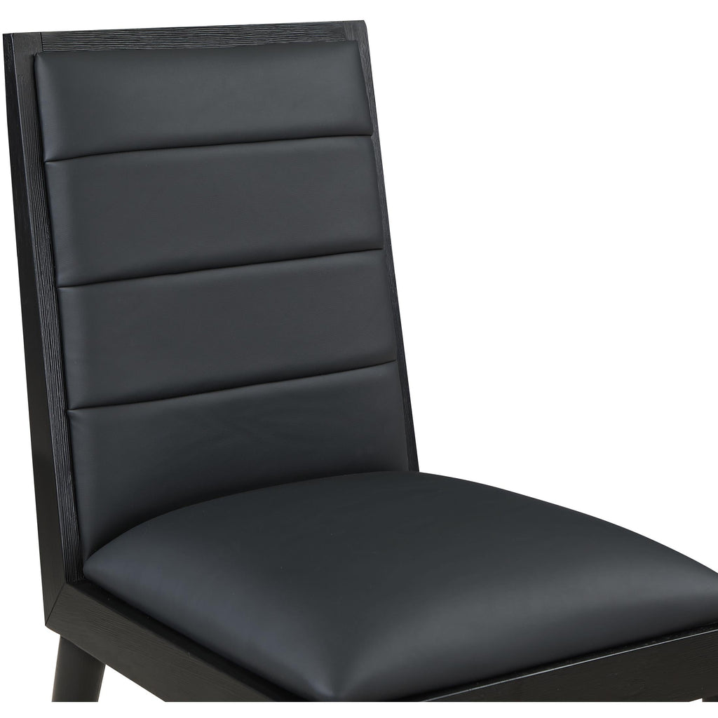 Rehab your dining room with these beautifully modern Bristol vegan leather dining chairs. Soft black vegan leather is the star of the show when it comes to this Bristol chair, giving you the rich, upscale look of leather without the added care requirements of the real thing. Channel tufting on the chair's back adds visual and textural interest while keeping the padding inside aloft and preventing shifting. A black finished solid wood frame in a contrasting woodgrain adds contrast and ensures this dining chair is a showstopper.