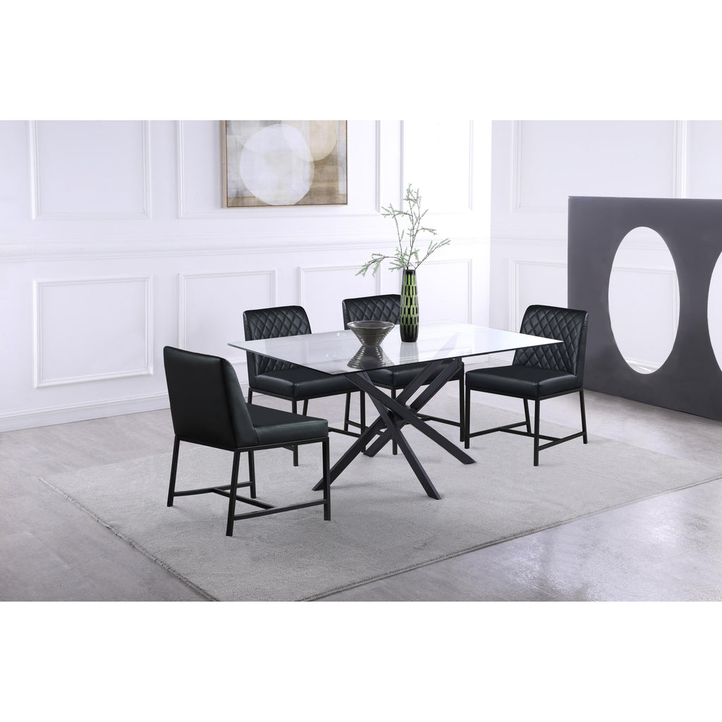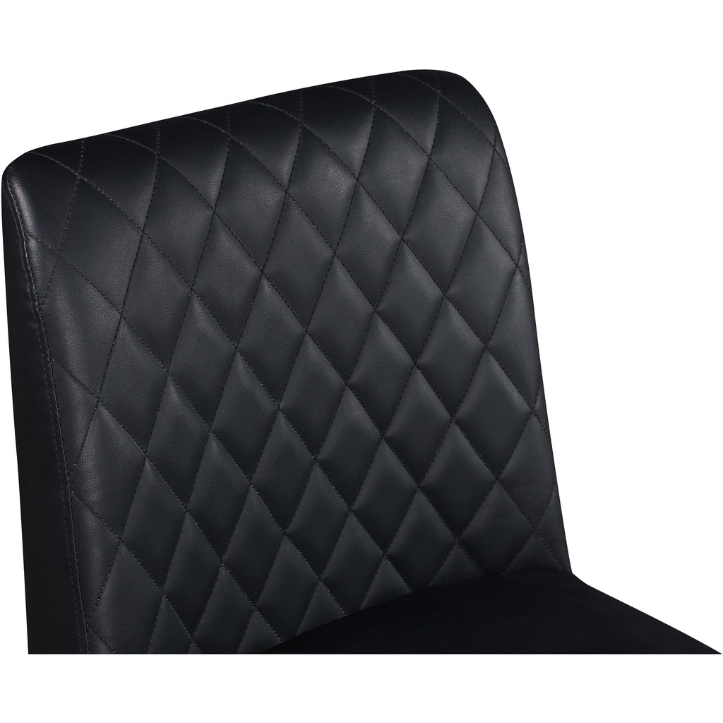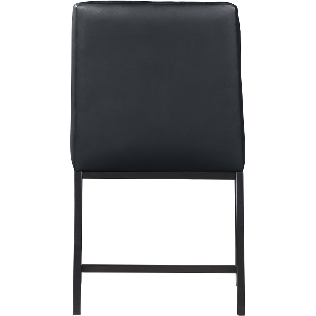 Give your dining room a revamp with this Bryce Vegan Leather Dining Chair from Meridian Furniture. This handsome chair features an armless design with heavily padded seat and back cushions, ensuring that guests stay comfortable all the way through dessert. The back is quilted for added aesthetic appeal, and it's upholstered in black vegan leather for the luxury look of leather without the maintenance requirements. A metal frame and matte black metal legs complete the look and provide sturdy support.
