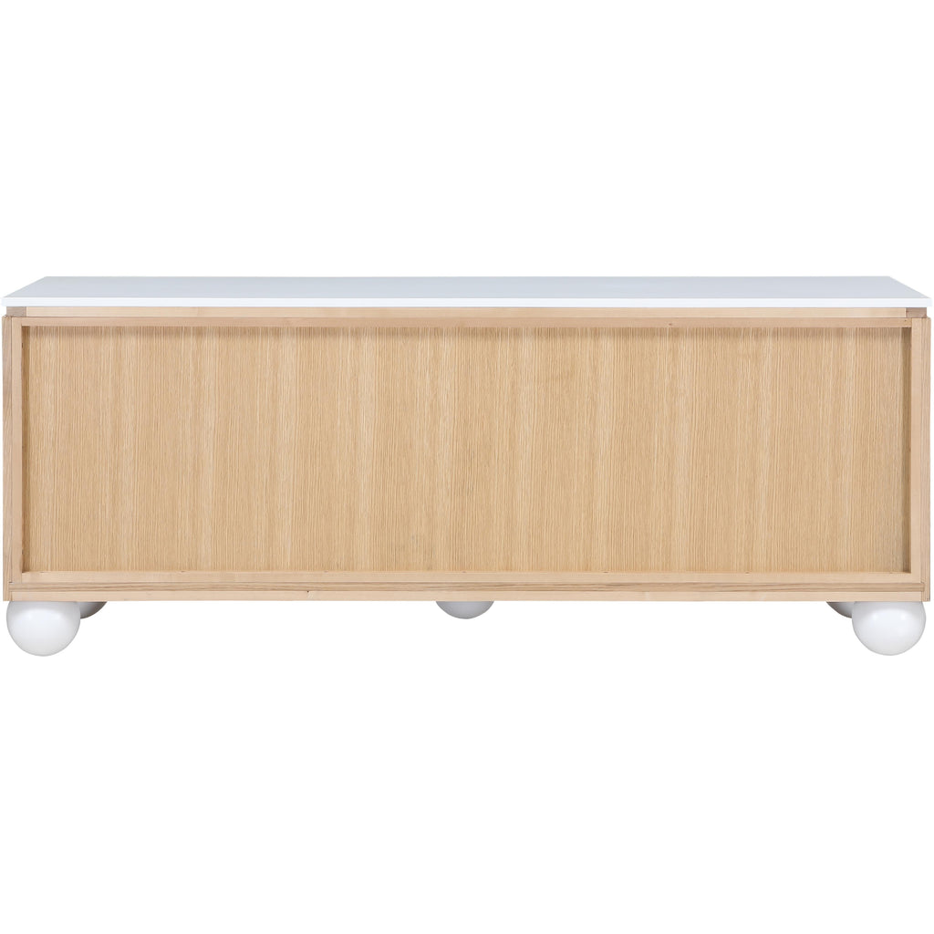 Transform your dining space into a haven of modern elegance with the Cardiff Natural Sideboard Buffet. Featuring a rich natural oak finish contrasted with white lacquer legs and top, it creates a sleek and modern aesthetic. Crafted mostly from solid wood with oak veneer made from rubberwood, as well as some parts made from MDF plywood, It boasts natural wood grain variation for added charm. This versatile piece serves as an elegant storage solution and a stylish platform for decorations. With doors designed to conceal cutlery, dishes, napkins, and dining supplies, it ensures your dining area stays organized and clutter-free. Elevate your dining experience with this handsome sideboard buffet that meshes practicality and sophistication effortlessly.
