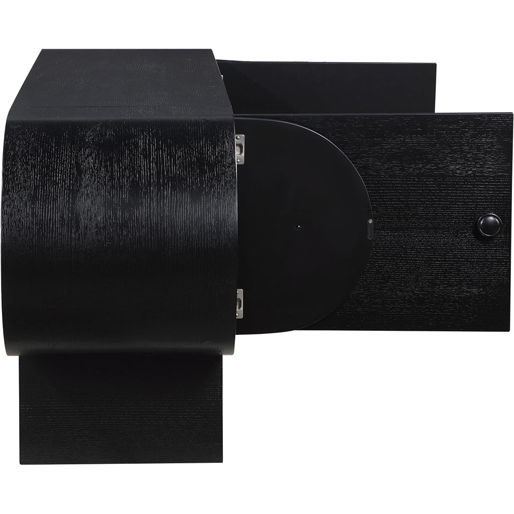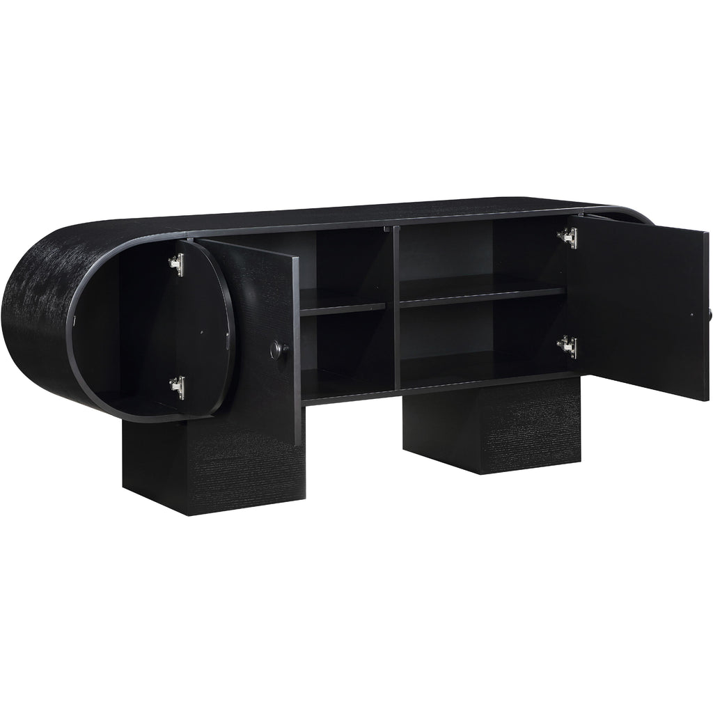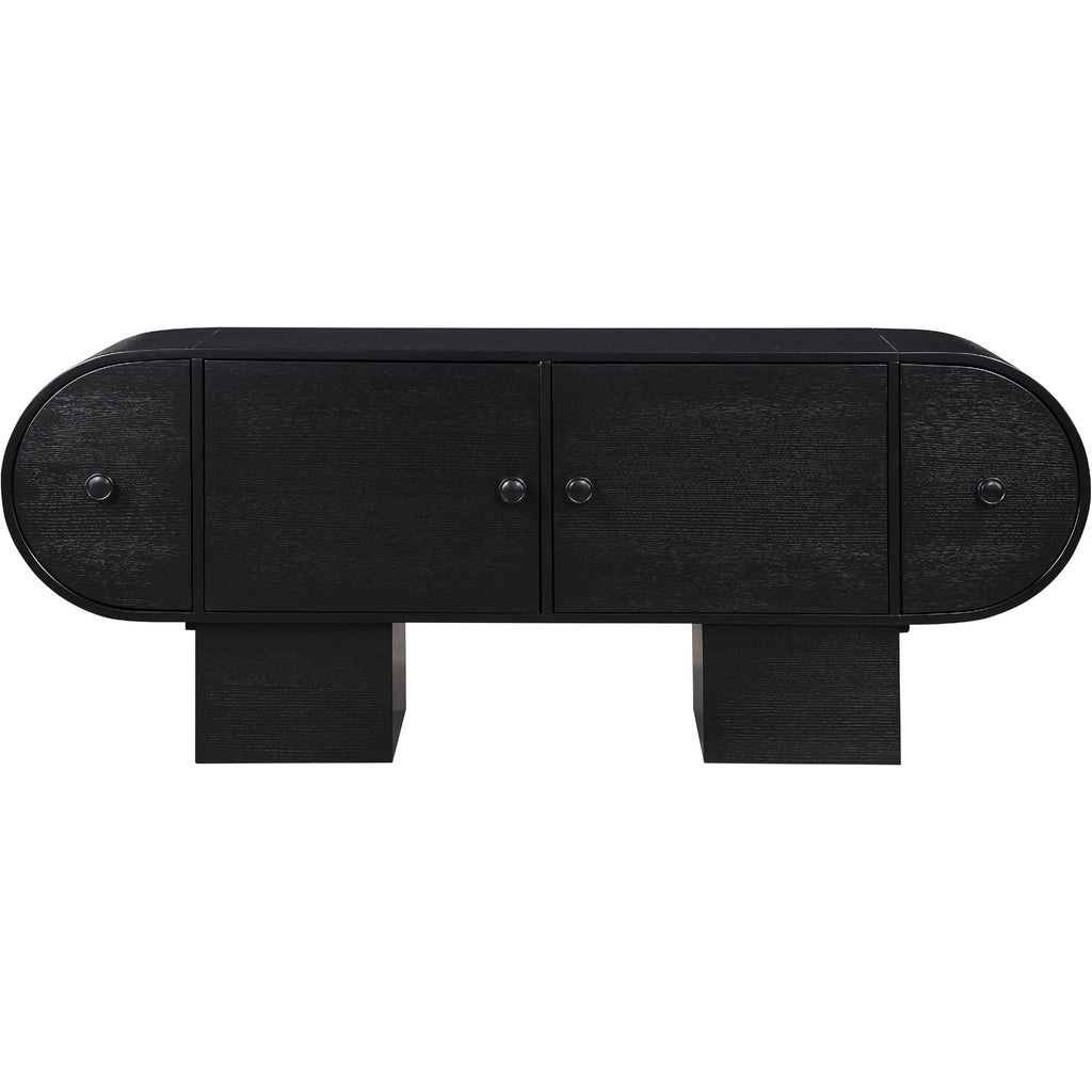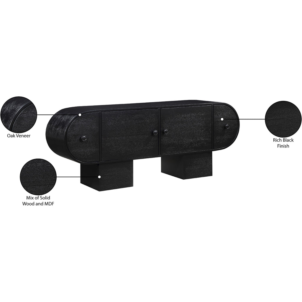 Relax knowing the things you need most are tucked out of sight and within easy reach with this Harlow black sideboard/buffet. Its rich black finish and oak veneer, crafted from a mix of solid wood and MDF, embody art deco elegance. Featuring natural wood grain variation, each piece is uniquely beautiful. Multiple drawers with an attractive pull offers discreet storage, blending practicality with timeless design. Enhance your living space with this sophisticated accent that combines function with exquisite craftsmanship.