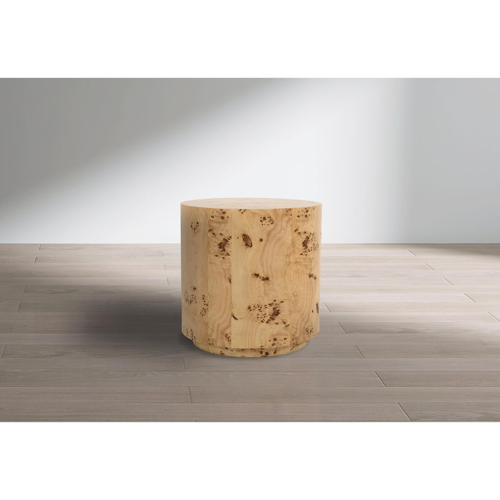 Give your space a woodsy feel with this Burl end table. So named for its ash burl wood construction, this lovely table has a natural ash finish that's lovely to behold in a number of different settings. An easy option for adding art deco styling to your space, this table features a round top that compliments the coffee table or any room.