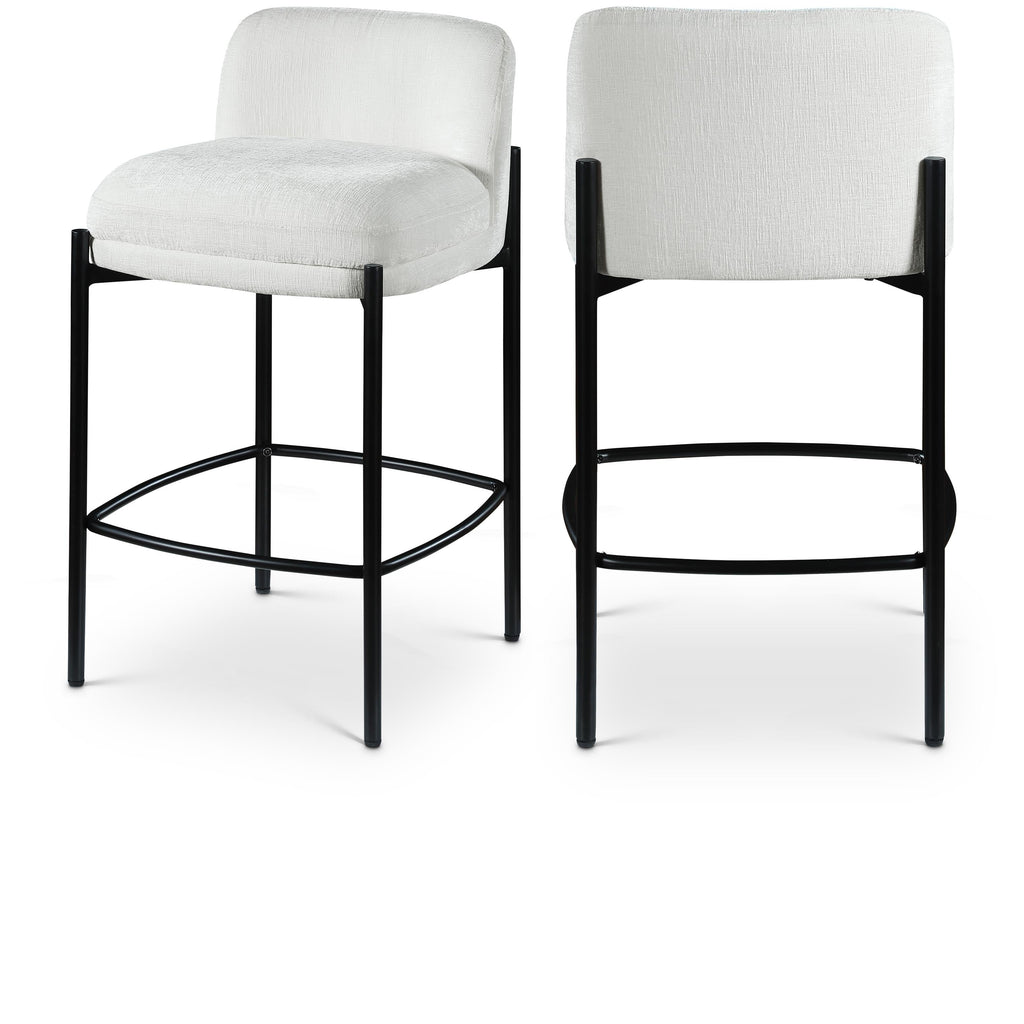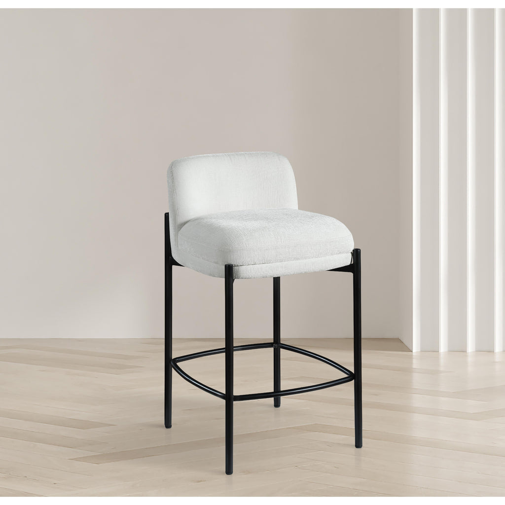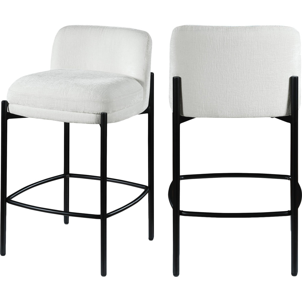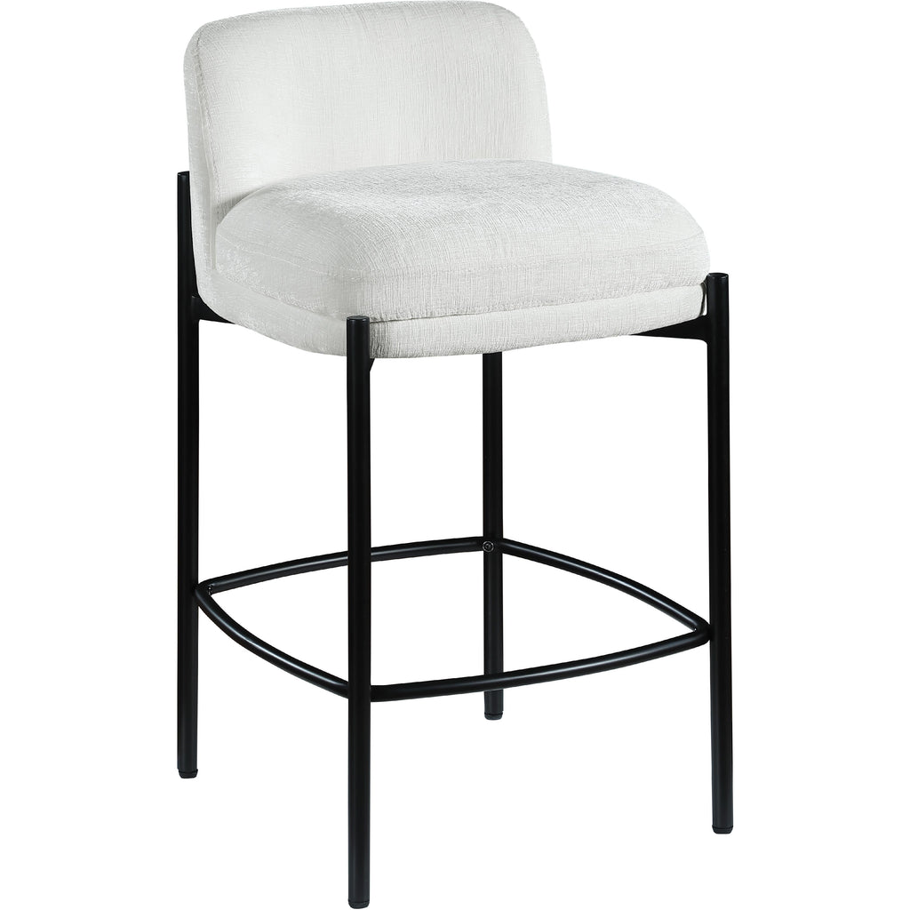 Make your kitchen counter or home bar your family's favorite spot to be with these cream Burton chenille fabric bar/counter stools. Each stool boasts soft cream chenille fabric and a sturdy matte black metal frame, ensuring both comfort and durability. A footrail across the bottom adds to the comfort factor of these handsome stools. Sold in sets of two per carton, these counter stools offer stylish and functional seating while infusing your space with a chic and modern touch.