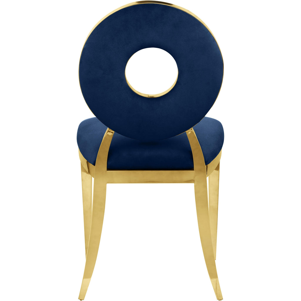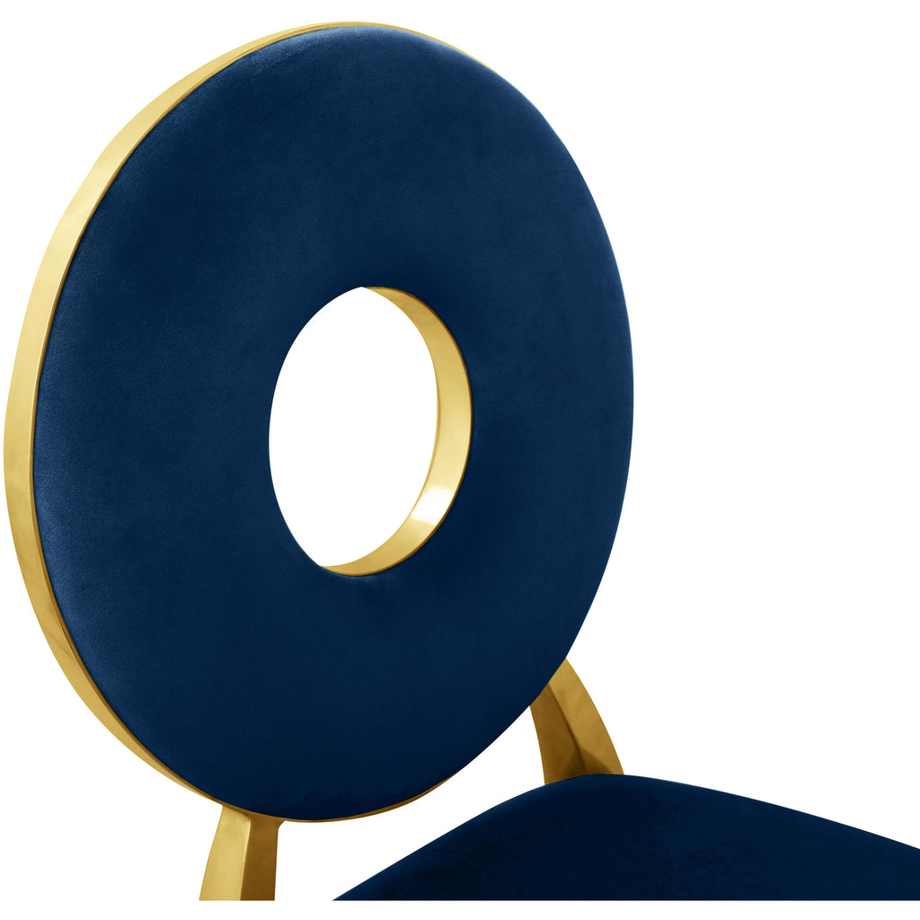 Yield to the decorator within when you bring home this Carousel velvet dining chair. This chair features a metal frame and legs finished in gold stainless steel for a modern touch, but the real star of the show is the donut-shaped seat back that exudes undeniable contemporary charm. The seat and back are both plumply filled for comfort and upholstered in soft navy velvet for a chic look.