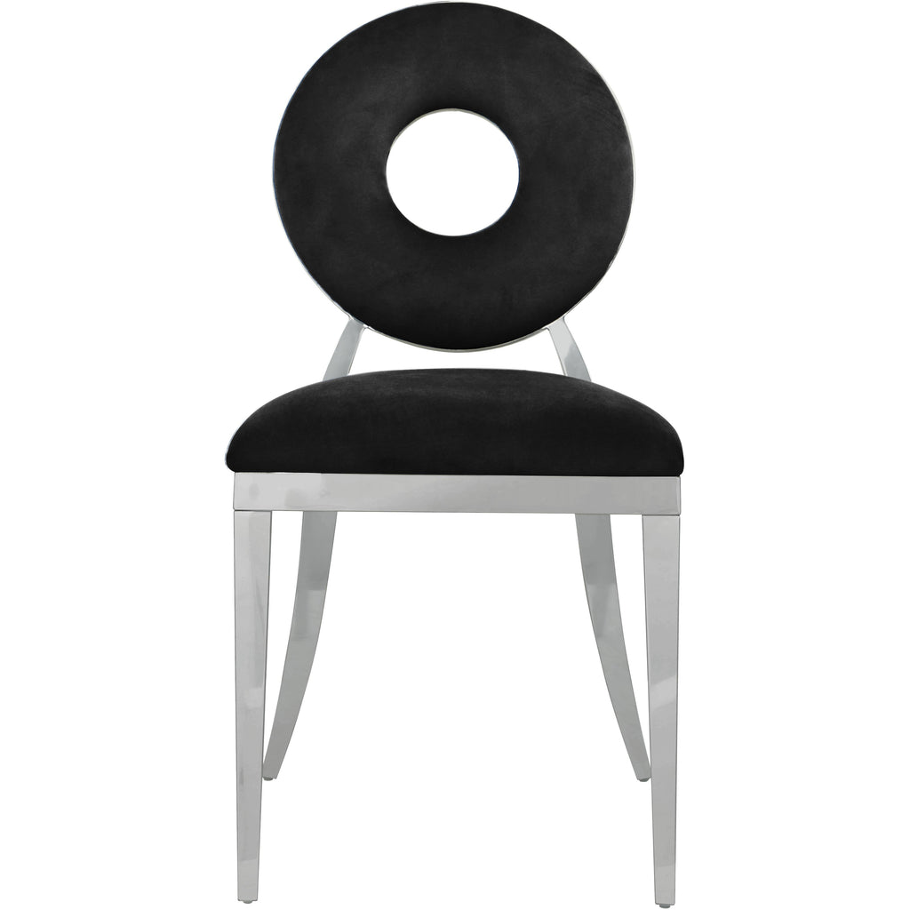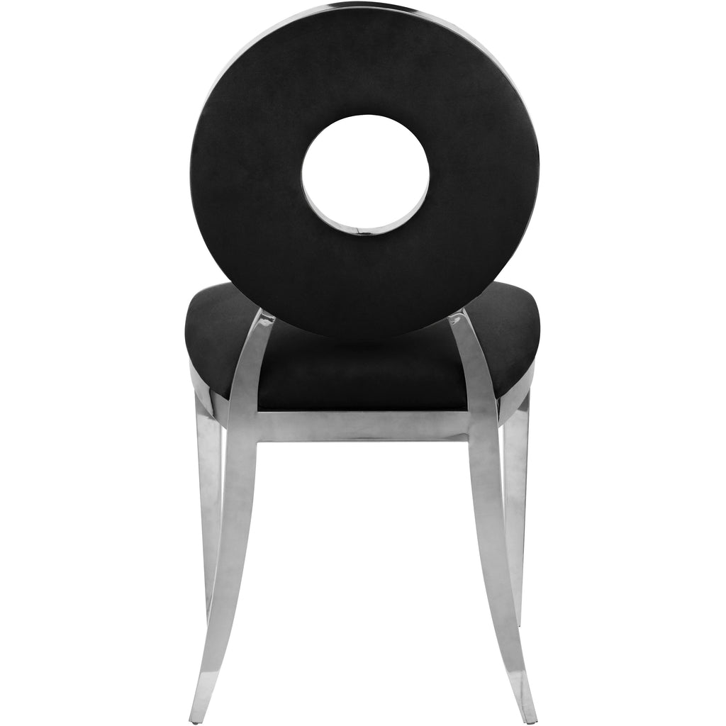 Yield to the decorator within when you bring home this Carousel velvet dining chair. This chair features a metal frame and legs finished in chrome stainless steel for a modern touch, but the real star of the show is the donut-shaped seat back that exudes undeniable contemporary charm. The seat and back are both plumply filled for comfort and upholstered in black velvet for a chic look.
