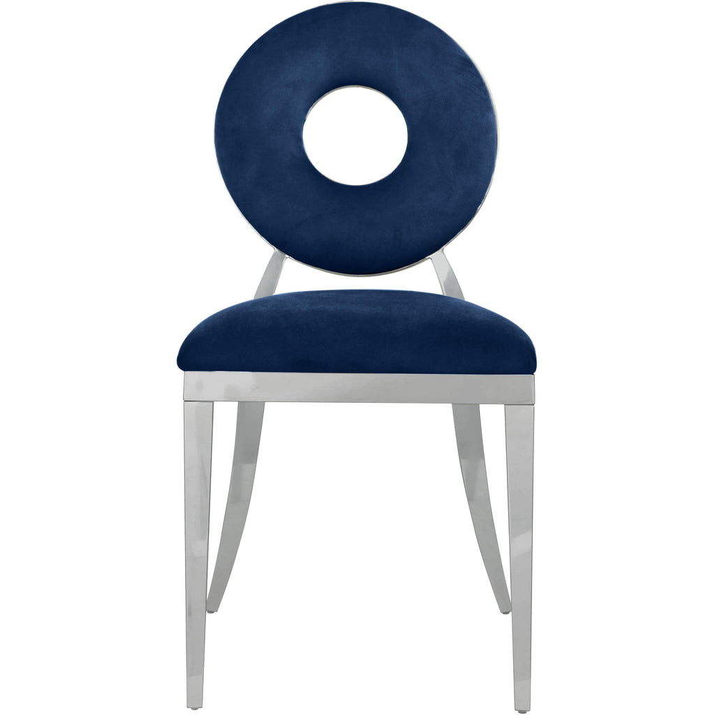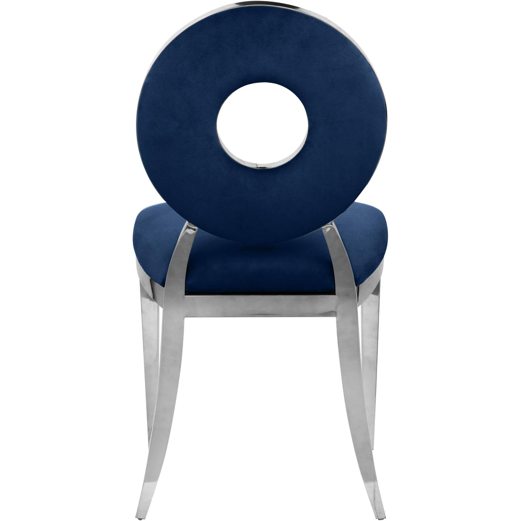 Yield to the decorator within when you bring home this Carousel velvet dining chair. This chair features a metal frame and legs finished in chrome stainless steel for a modern touch, but the real star of the show is the donut-shaped seat back that exudes undeniable contemporary charm. The seat and back are both plumply filled for comfort and upholstered in soft navy velvet for a chic look.