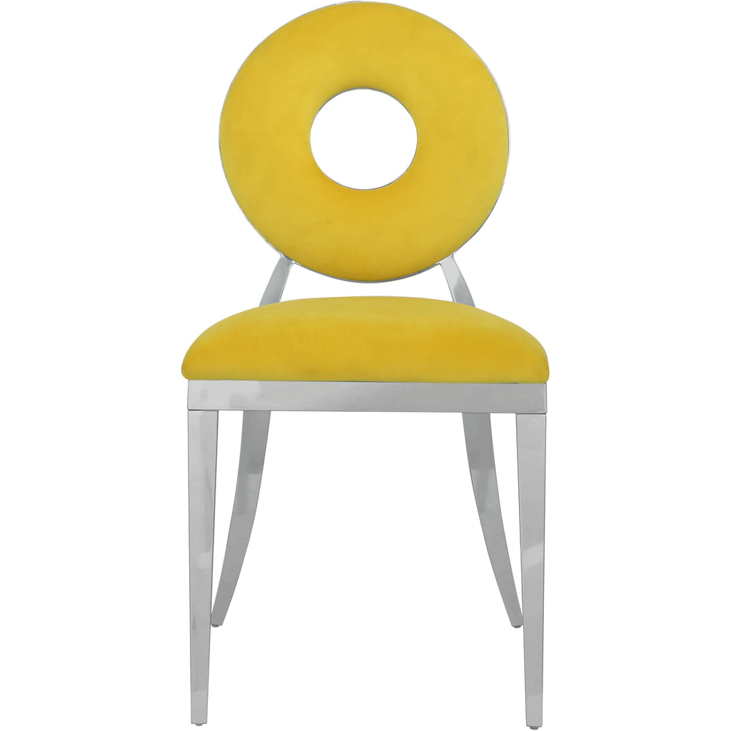 Yield to the decorator within when you bring home this Carousel velvet dining chair. This chair features a metal frame and legs finished in chrome stainless steel for a modern touch, but the real star of the show is the donut-shaped seat back that exudes undeniable contemporary charm. The seat and back are both plumply filled for comfort and upholstered in soft yellow velvet for a chic look.